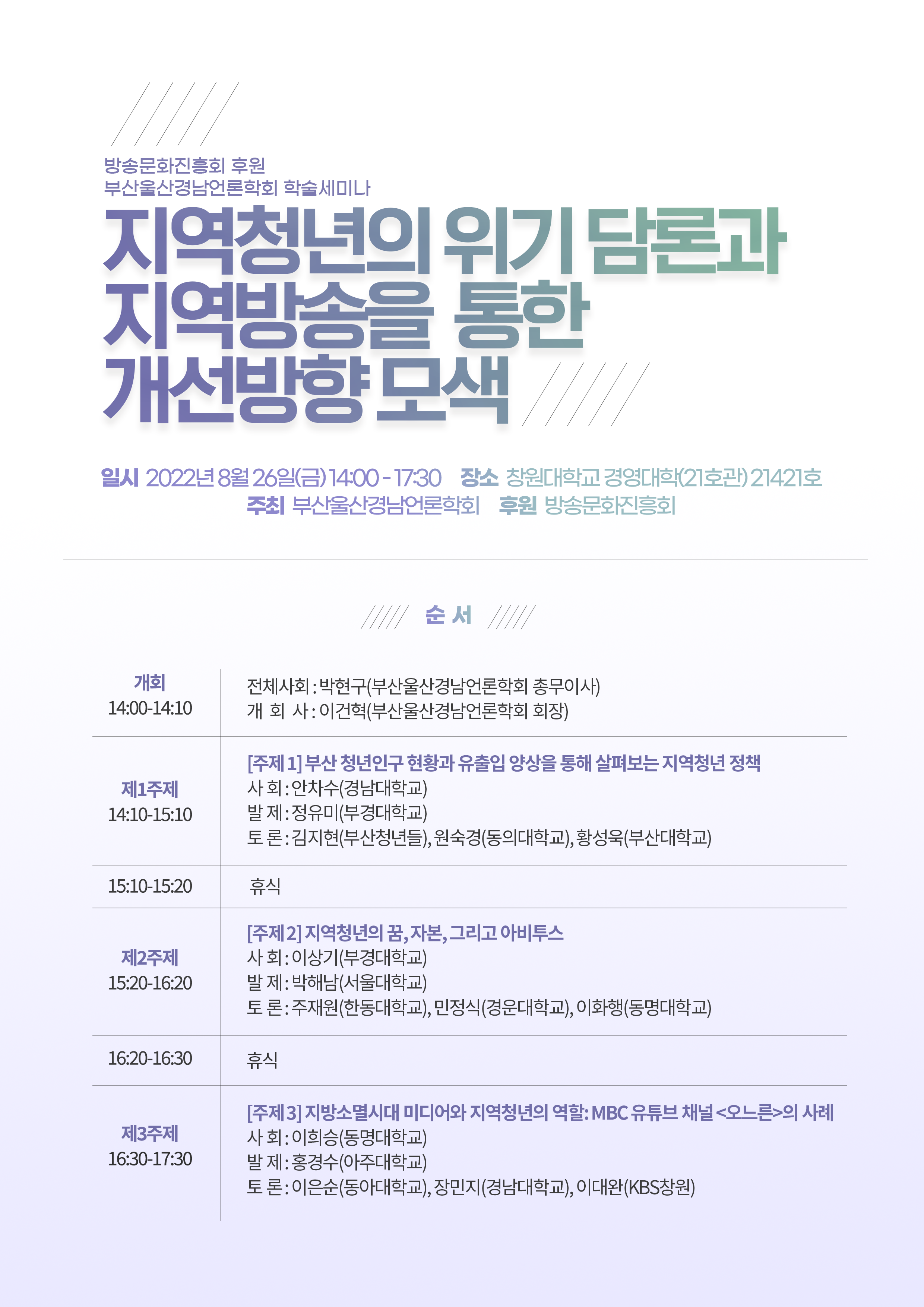 2. 방송문화진흥회의 후원으로 부산울산경남언론학회가 주최하는 <지역청년의 위기 담론과 지역방송을 통한 개선방향 모색> 학술세미나가 다음과 같이 8월 26일(금) 창원대학교에서 개최됩니다. 회원님들의 많은 관심과 참여를 부탁드립니다.