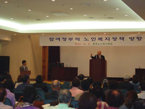 2003년 10월 31일(금) 한국사회복지회관 대강당에서 학회 회원 및 주요인사 150여명이 참석한 가운데 <참여정부의 노인복지정책방향>이라는 대주제로 열린 2003년 추계학술대회에서 한국노년유권자연맹 전수철 총재가 축사를 전하고 있다./ 촬영자 : 김나영