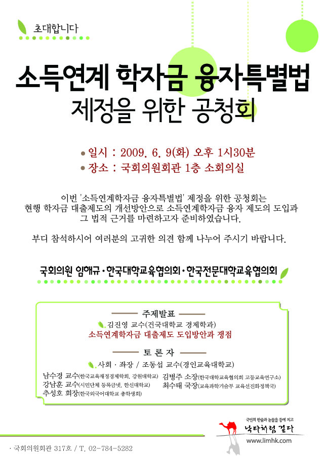 한국대학교육협의회는 현행 학자금 대출제도 개선 방안으로『소득연계학자금 융자특별법 제정을 위한 공청회』를 다음과 같이 개최하고자 합니다. 바쁘시더라도 많은 참석 부탁드립니다. - 다 음 - ㅁ 일시 : 2009년 6월 9일(화) 오후1시30분 ㅁ 장소 : 국회 의원회관 1층 소회의실 ㅁ 주최 : 국회의원 임해규․한국대학교육협의회․한국전문대학교육협의회 ㅁ 문의처 : 대교협 정책연구부 김정희 ☎02)6393-5276