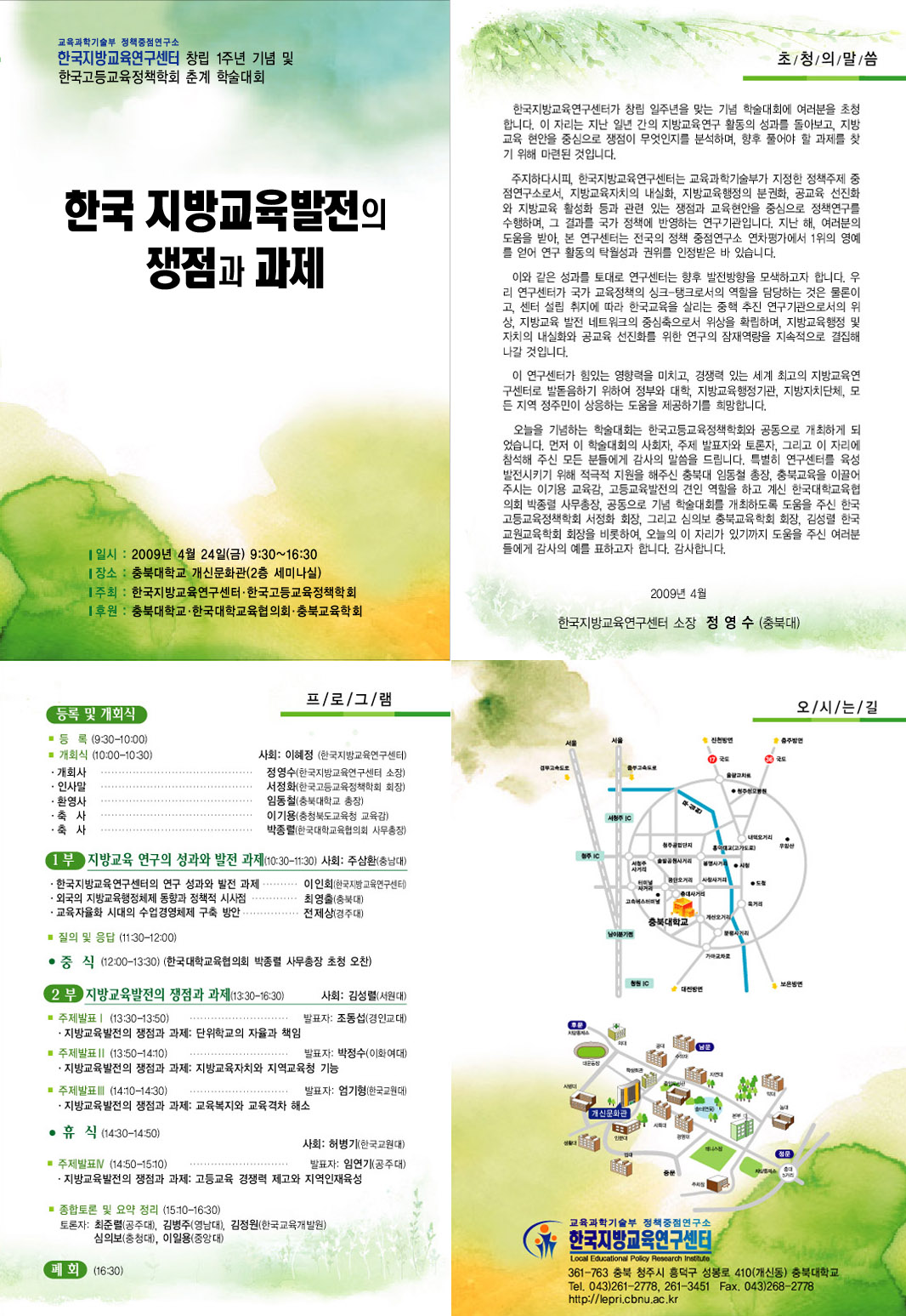 한국지방교육연구센터에서 오는 4월 24일(금) 충북대학교에서 한국지방교육센터 창립 1주년 기념 및 한국고등교육정책학회 춘계 학술대회를 개최한다고 합니다. 회원님들의 많은 관심과 참여 바랍니다. <개요> * 주제 : 한국 지방교육발전의 쟁점과 과제 * 일시 : 2009년 4월 24일(금), 9:30~16:30 * 장소 : 충북대학교 개신문화관 (2층 세미나실) * 주최 : 한국지방교육연구센터, 한국고등교육정책학회 * 후원 : 충북대학교, 한국대학교육협의회, 충북교육학회 * 자료집은 행사 당일 배부하며, 행사가 끝나면 pdf 파일로 홈페이지 공지사항에서 다운 받으실 수 있습니다.(홈페이지 주소 : http://lepri.cbnu.ac.kr/) * 문의처: 한국지방교육연구센터 전임연구원 이인회 (043)262-3451 행정조교 하정윤 (043)261-2778 연구조교 연준모 (043)261-3451 <프로그램> ▶ 등록 및 개회식 ○ 등록: (9:30-10:00) ○ 개회식(10:00-10:30) ------------사회: 이혜정(한국지방교육연구센터) 개 회 사 -------------------- 정영수(한국지방교육연구센터 소장) 인 사 말 -------------------- 서정화(한국고등교육정책학회 회장) 환 영 사 -------------------- 임동철(충북대학교 총장) 축 사 -------------------- 이기용(충청북도교육청 교육감) 축 사 -------------------- 박종렬(한국대학교육협의회 사무총장) 1부: 지방교육 연구의 성과와 발전 과제(10:30-11:30) ------사회: 주삼환(충남대) ○ 한국지방교육연구센터의 연구 성과와 발전 과제 ---이인회(한국지방교육연구센터) ○ 외국의 지방교육행정체제 동향과 정책적 시사점 ---------- 최영출(충북대) ○ 교육자율화 시대의 수업경영체제 구축 방안 -------------- 전제상(경주대) ▶ 질의 및 응답(11:30-12:00) ▷ 중식(12:00-13:30)-(한국대학교육협의회 박종렬 사무총장 초청 오찬) 2부: 지방교육발전의 쟁점과 과제(13:30-16:30) -------- 사회: 김성렬(서원대) ▶ 주제발표Ⅰ (13:30-13:50) ------------------------------------------- 조동섭(경인교대) ○ 지방교육발전의 쟁점과 과제: 단위학교의 자율과 책임 ▶ 주제발표 Ⅱ (13:50-14:10) ------------------------------------------- 박정수(이화여대) ○ 지방교육발전의 쟁점과 과제: 지방교육자치와 지역교육청 기능 ▶ 주제발표 Ⅲ (14:10-14:30) ------------------------------------------- 엄기형(한국교원대) ○ 지방교육발전의 쟁점과 과제: 교육복지와 교육격차 해소 ▷ 휴식(14:30-14:50) ▶ 주제발표 Ⅳ (14:50-15:10) ----------------------------------------------- 사회: 허병기(한국교원대) ○ 지방교육발전의 쟁점과 과제: 고등교육 경쟁력 제고와 지역인재육성 --- 임연기(공주대) ▶ 종합토론 및 요약 정리(15:10-16:30) ○ 토론자: 최준렬(공주대), 김병주(영남대), 김정원(한국교육개발원), 심의보(충청대), 이일용(중앙대) ▷ 폐회(16:30)