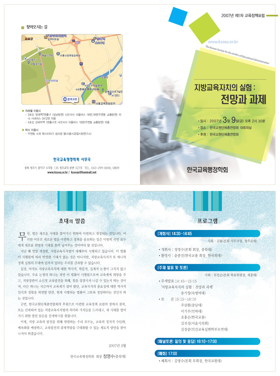 한국교육행정학회 회원님들께. 우리 학회에서는 다음과 같이 제1차 교육정책포럼을 개최하고자 합니다. 회원님들의 많은 참여를 부탁드립니다. - 다 음 - 주제: 지방교육자치의 실험: 전망과 과제 일시: 2007년 3월 9일(금) 14:30 장소: 한국교원단체총연합회 대회의실 후원: 한국교육행정학회 발표: 송기창(숙명여대) 토론: 주삼환(충남대) 이기우(인하대) 조흥순(한국교총) 김진성(서울시의회) 김장중(인간교육실현학부모연대) 첨부: 초청장 파일 # 정책포럼 직후 2007년도 제1차 이사회가 개최됩니다. # 첨부물이 작게 보일경우 마우스를 그림위에 올려놓고 그림의 우측 하단에 생성되는 확대버튼을 클릭하세요. 한국교육행정학회 학술위원회 위 원 장: 임천순(세종대) 부위원장: 조동섭(경인교대) 담 당: 간사 박영상