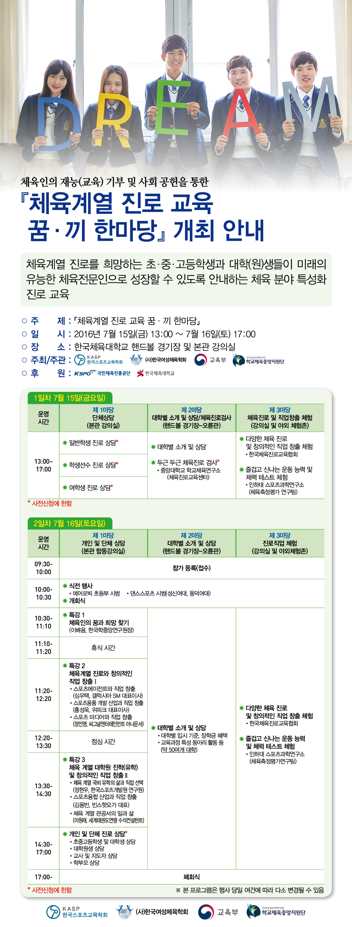 체육계열 진로를 희망하는 초?중?고등학생과 대학(원)생들이 미래의 유능한 체육전문인으로 성장할 수 있도록 안내하는 체육 분야 특성화 진로?직업 교육을 목적으로『체육계열 진로 교육 꿈?끼 한마당』 을 한국체육대학교에서 개최합니다.