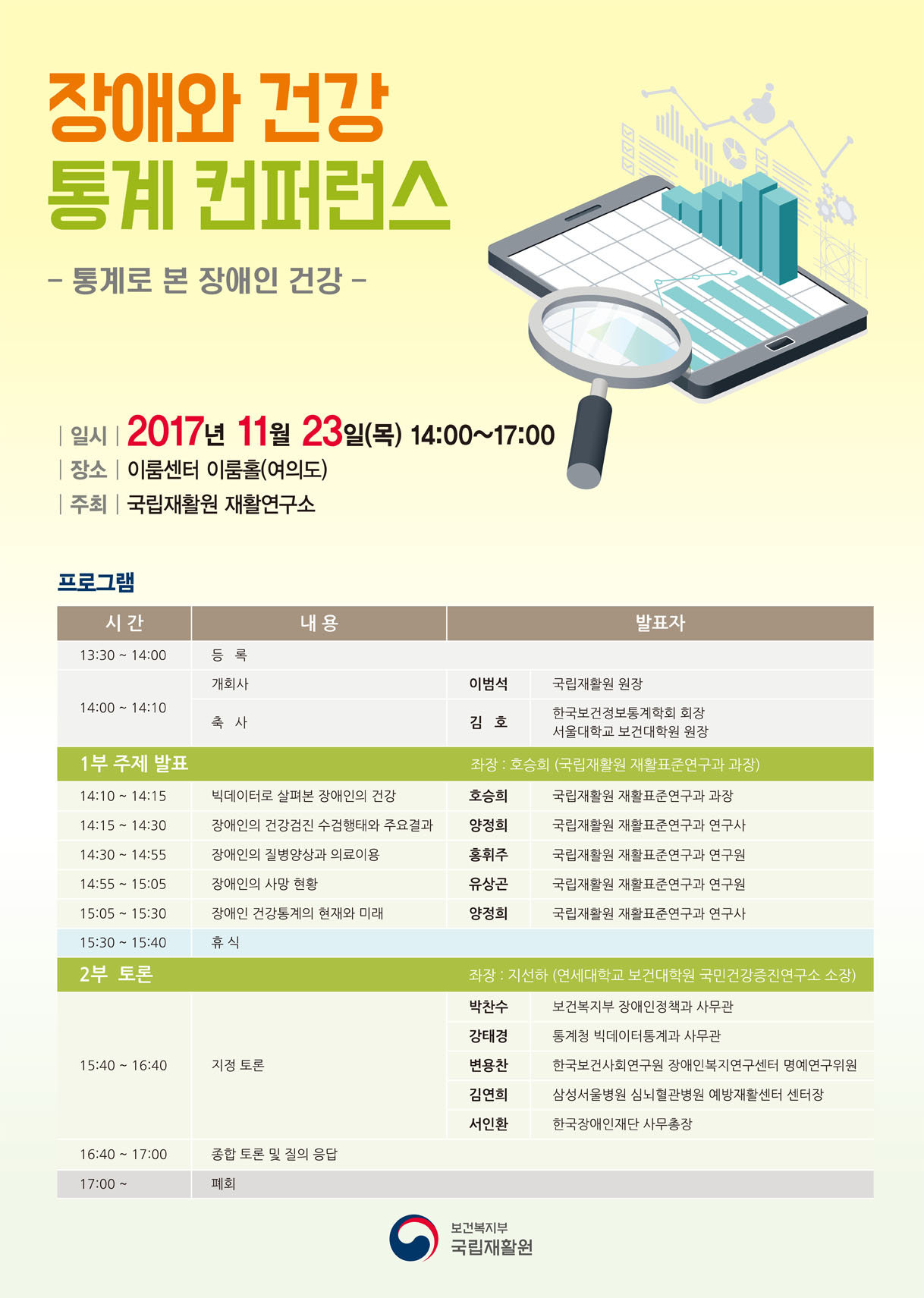 국립재활원 재활연구소는 장애인의 건강 통계 결과를 발표하고, 장애인 건강보건 통계의 현황 및 발전 방향에 대한 다양한 의견을 공유하기 위하여「장애와 건강 통계 컨퍼런스」 를 개최하오니 많은 관심과 참여를 부탁드립니다.