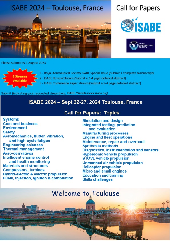 2024년 9월 22일 ~ 27일 프랑스 Toulouse에서 개최 예정인 26차 ISABE의 Call for Paper를 전달드립니다.