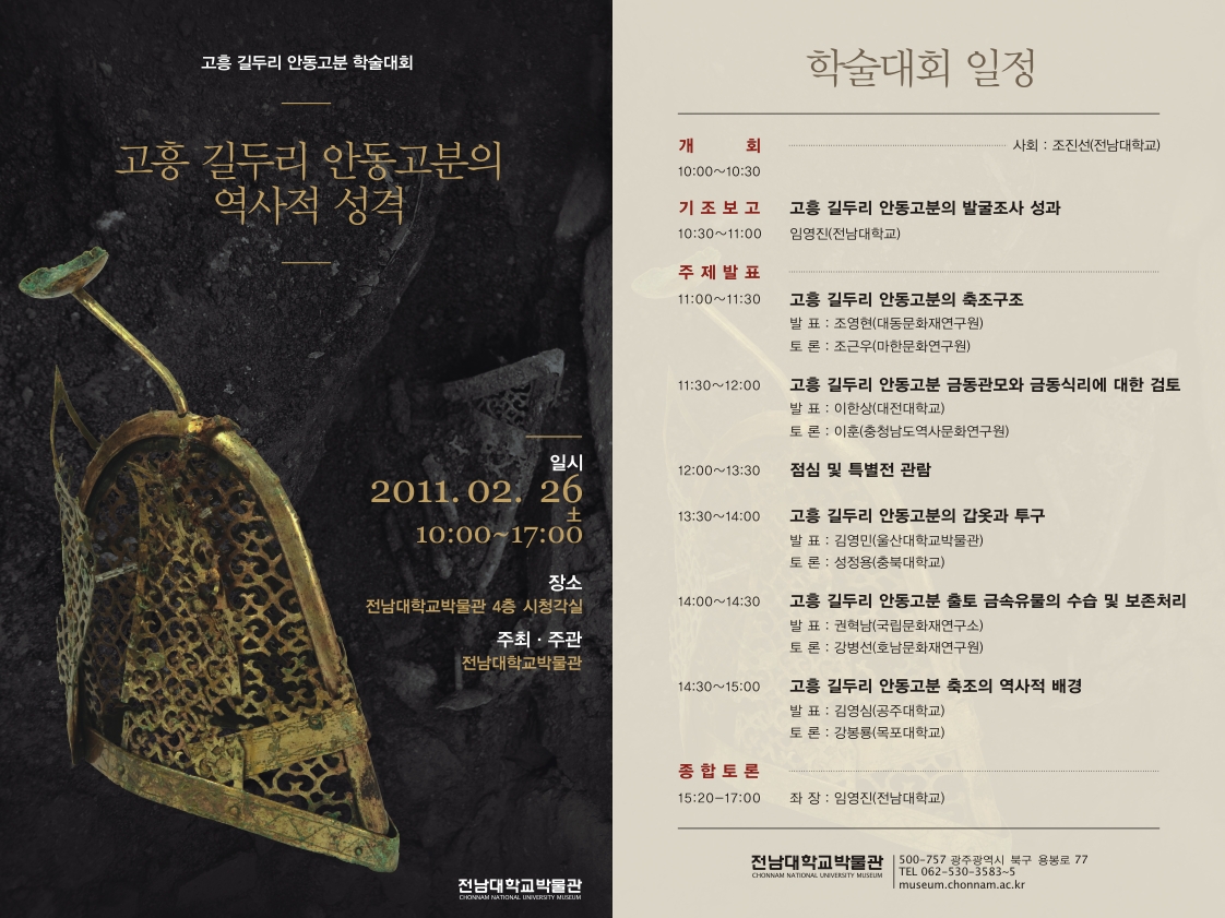 전남대학교박물관에서는 2011년 02월 26일(토) ‘고흥 길두리 안동고분의 역사적 성격’이라는 주제로 학술대회를 개최합니다.