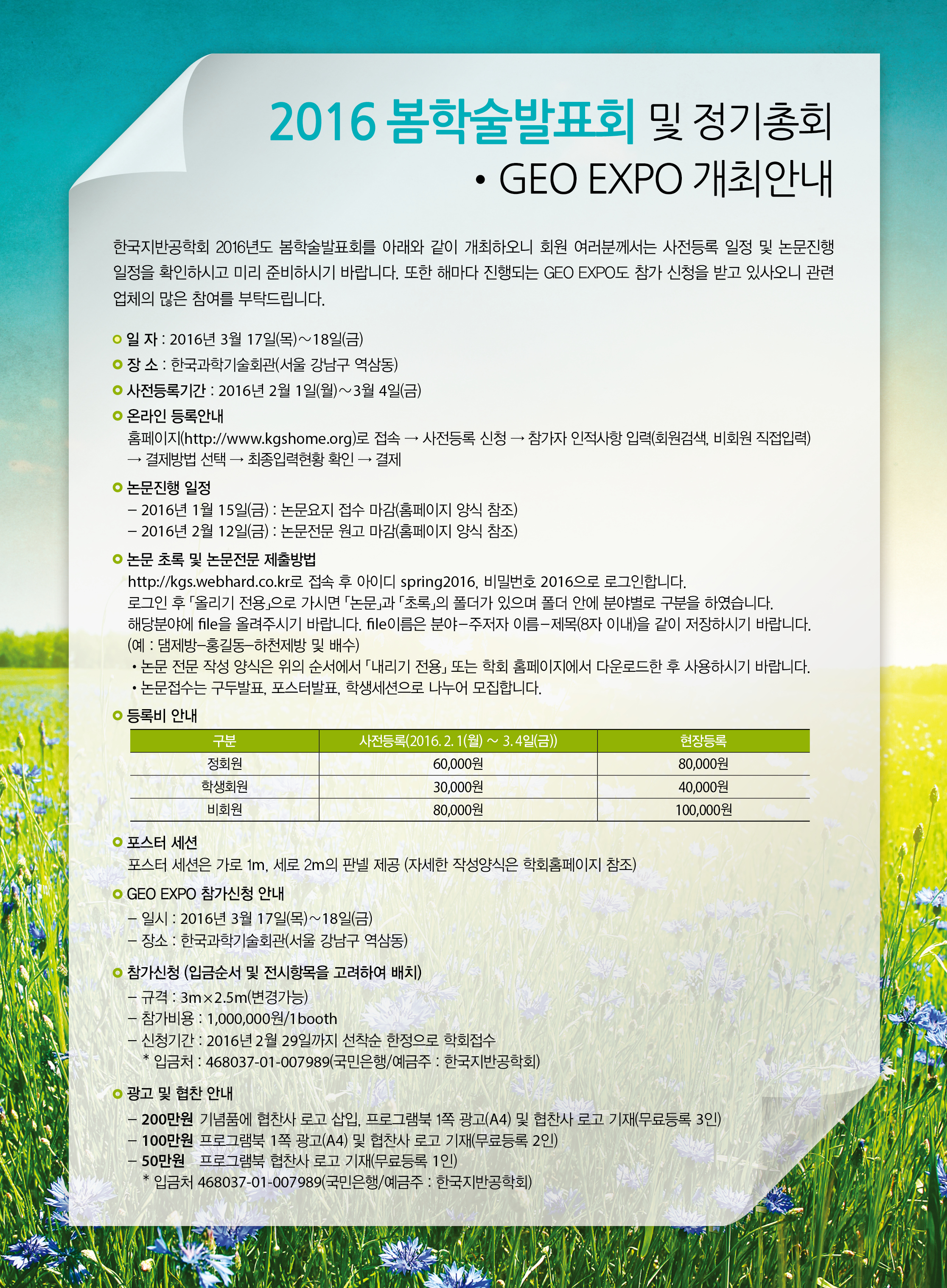 한국지반공학회 2016년도 정기총회 및 봄학술발표회를 아래와 같이 개최하오니 회원 여러분께서는 사전등록 일정 및 논문진행 일정을 확인하시고 미리 준비하시기 바랍니다.또한 해마다 진행되는 GEO EXPO도 참가 신청(선착순 접수)을 받고 있사오니 관련업체의 많은 참여를 부탁드립니다.