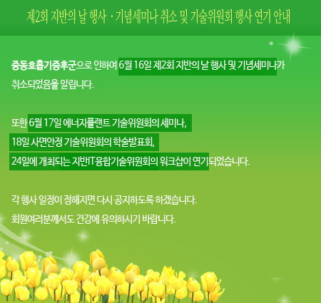 중동호흡기증후군으로 인하여 6월 16일 제2회 지반의 날 행사 및 기념세미나가 부득이하게 취소되었음을 알립니다.
