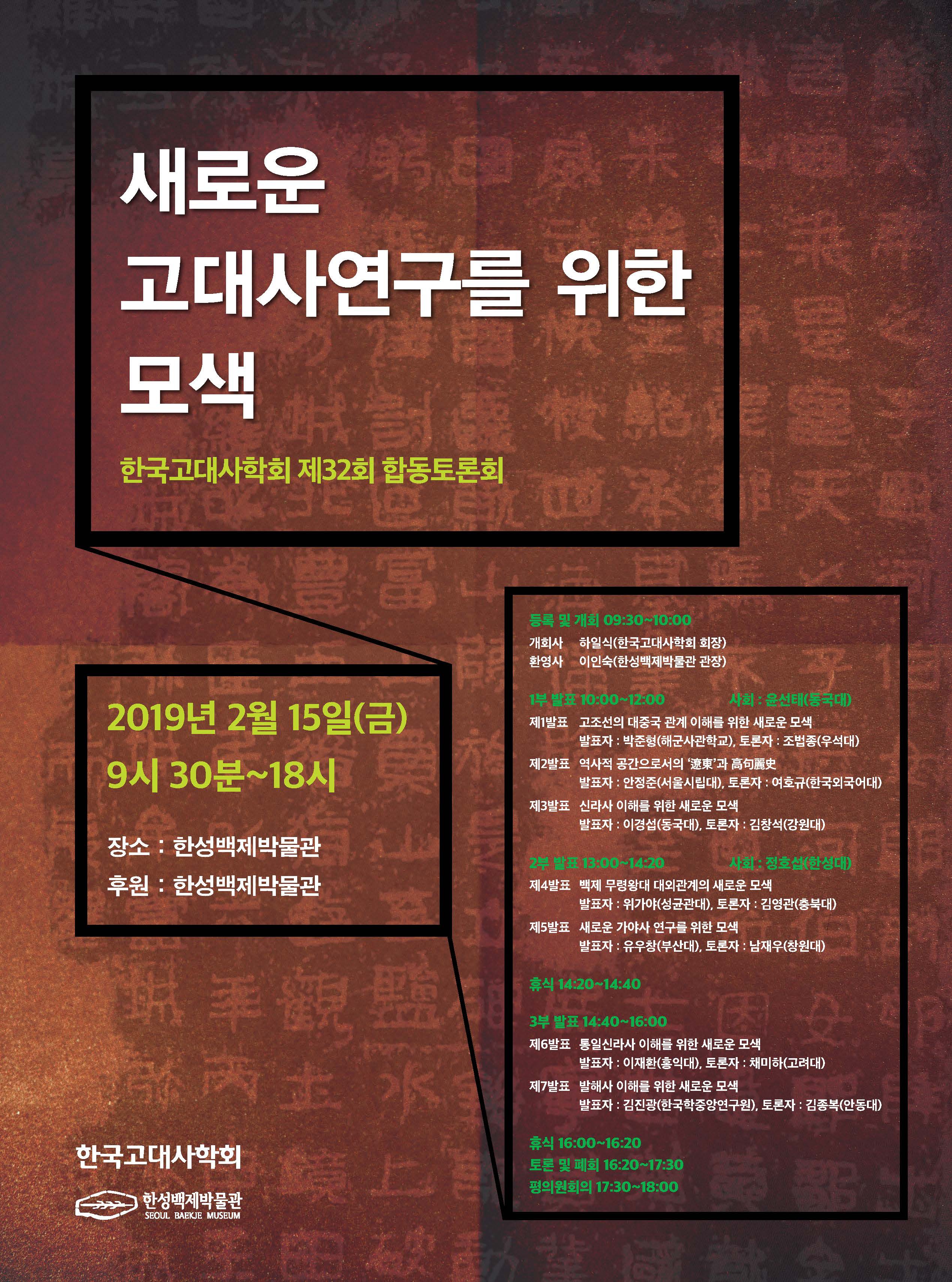 2019년 2월 15일 금요일에 한성백제박물관 강당에서 제32회 합동토론회를 개최합니다.