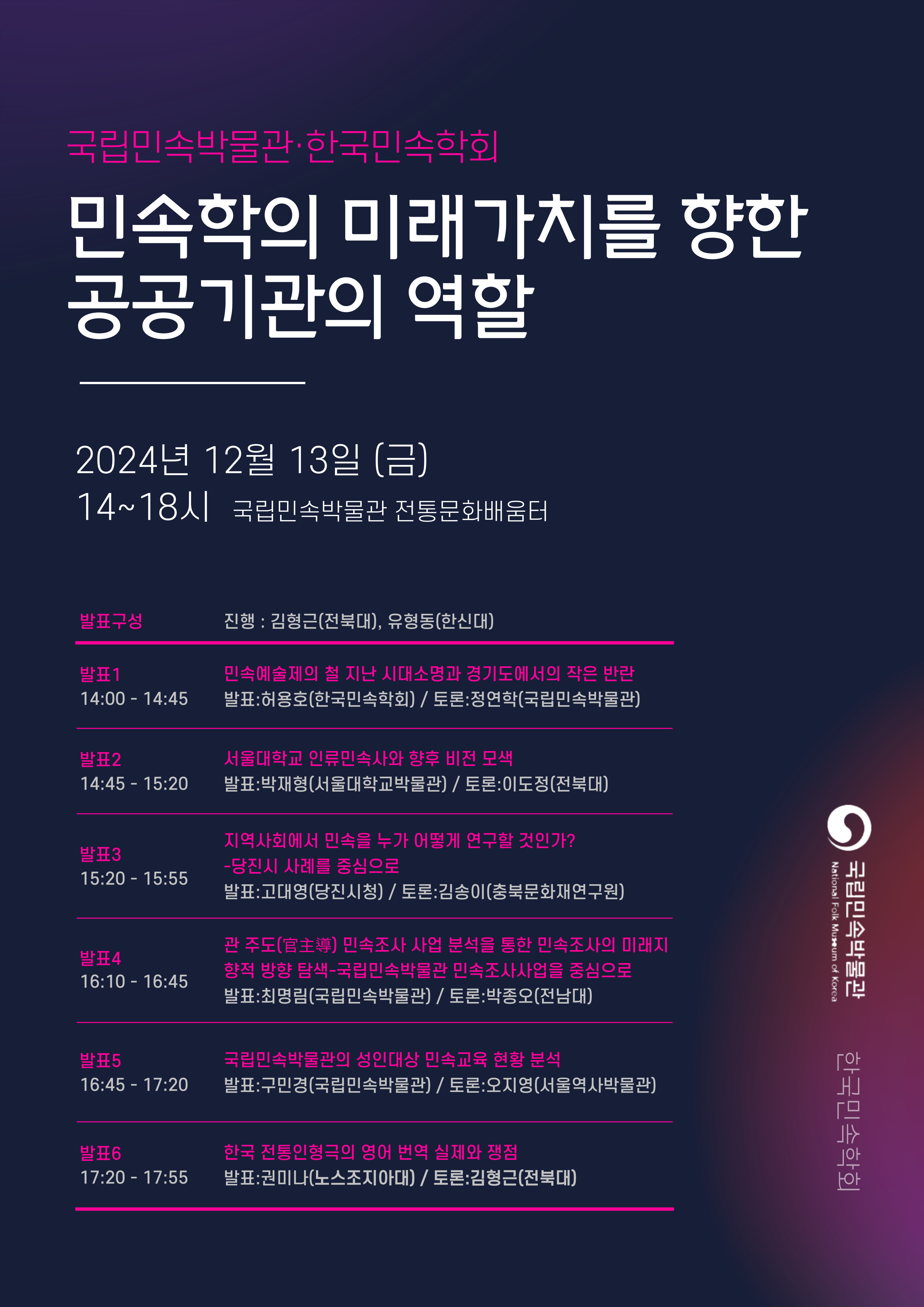 한국민속학회와 국립민속박물관에서는 ‘민속학의 미래가치를 향한 공공기관의 역할’을 주제로 공동학술대회를 갖고자 합니다.