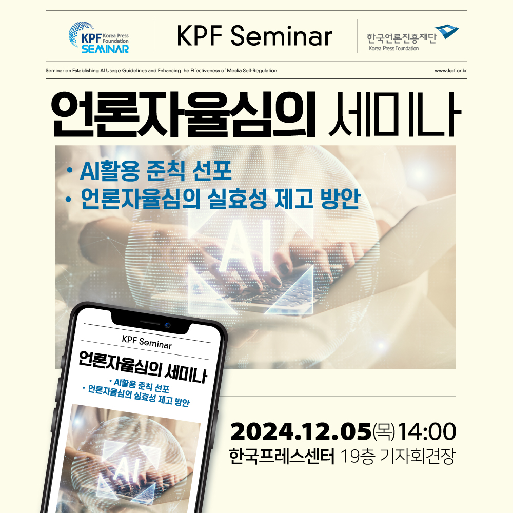 한국언론진흥재단에서 <언론자율심의> 세미나를 개최합니다. 참석을 희망하시는 분은 사전 신청을 받고 있으며 소정의 기념품도 준비되어 있으니 많은 관심 부탁드립니다. 1. 언론자율심의 세미나 일정 - 일시 : 2024년 12월 5일(목) 14:00 - 장소 : 한국프레스센터 19층 기자회견장 - 주요 내용 : <AI 활용 준칙 선포식> 및 자율심의 반영 방안 논의 <고충처리 활성화 등 자율심의 실효성 제고방안> 재단 공모 연구사업 결과 발표 및 논의 2. 세미나 사전 신청 요청 세미나 참석을 희망하시는 분은 사전 신청을 해주시길 부탁드립니다. 사전신청 URL : https://form.naver.com/response/lA8RNyKz2xuNF_qNTNS3nw |