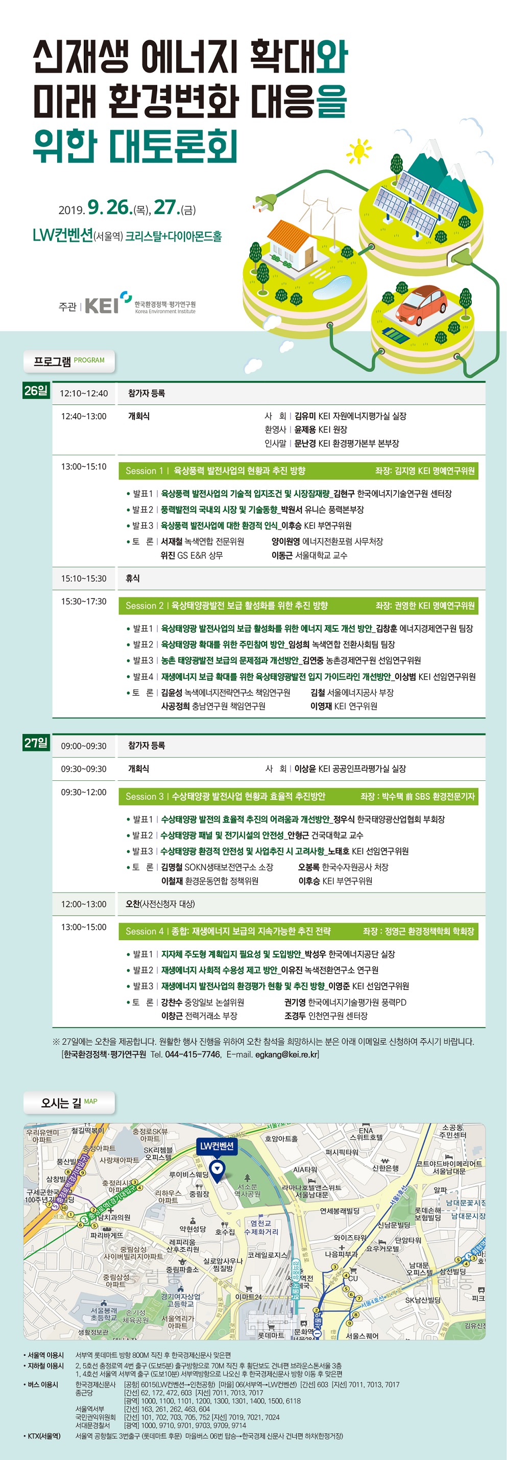 한국환경정책.평가연구원에서 '신재생 에너지 확대와 미래 환경변화 대응을 위한 대토론회'를 아래와 같이 개최 합니다.