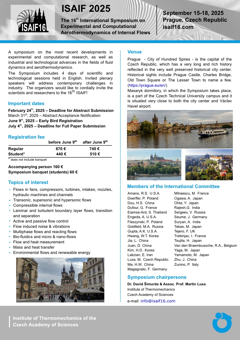 The 16th International Symposium on Experimental and Computational Aerothermodynamics of Internal Flows(ISAIF16) 안내