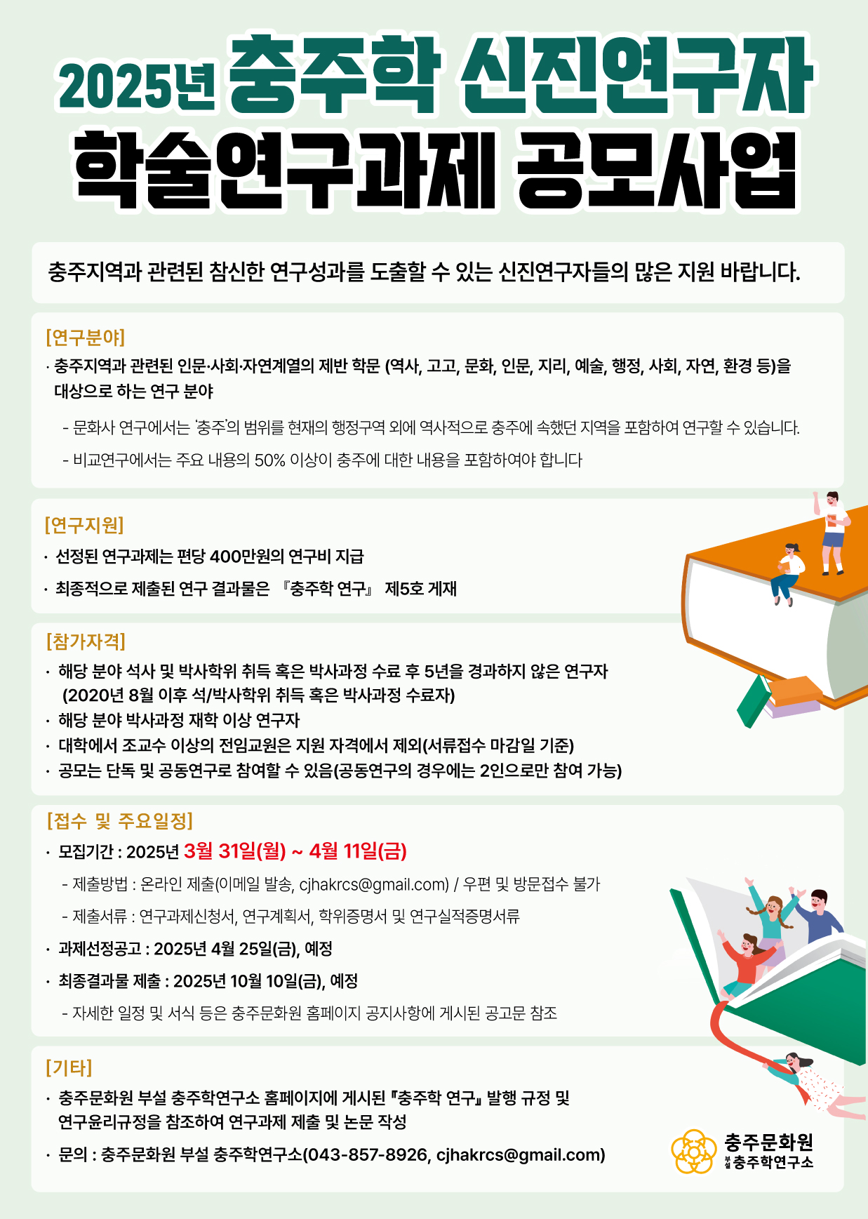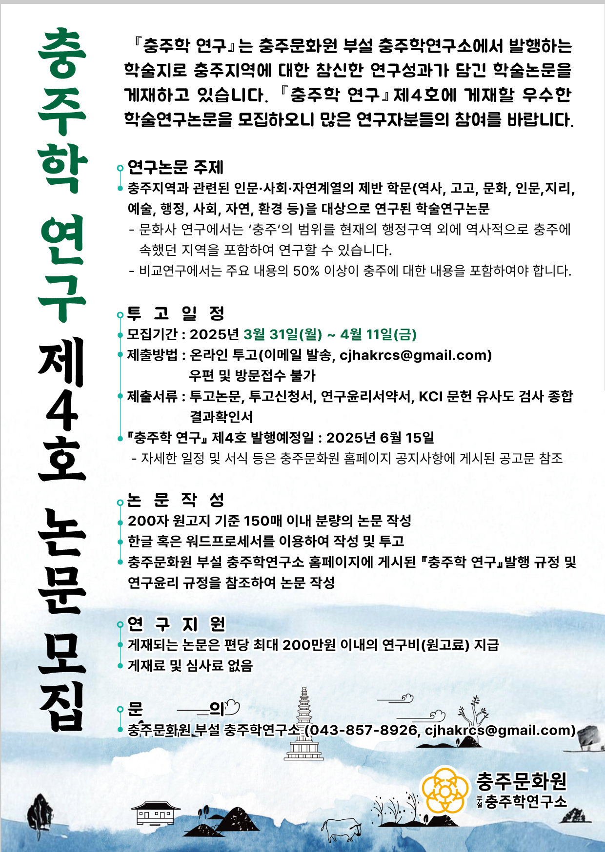- 지원방법 : 온라인 접수(이메일 발송, cjhakrcs@gmail.com), 메일 제목에 [2025 충주학 신진연구자 학술연구과제 신청] 글머리 기재