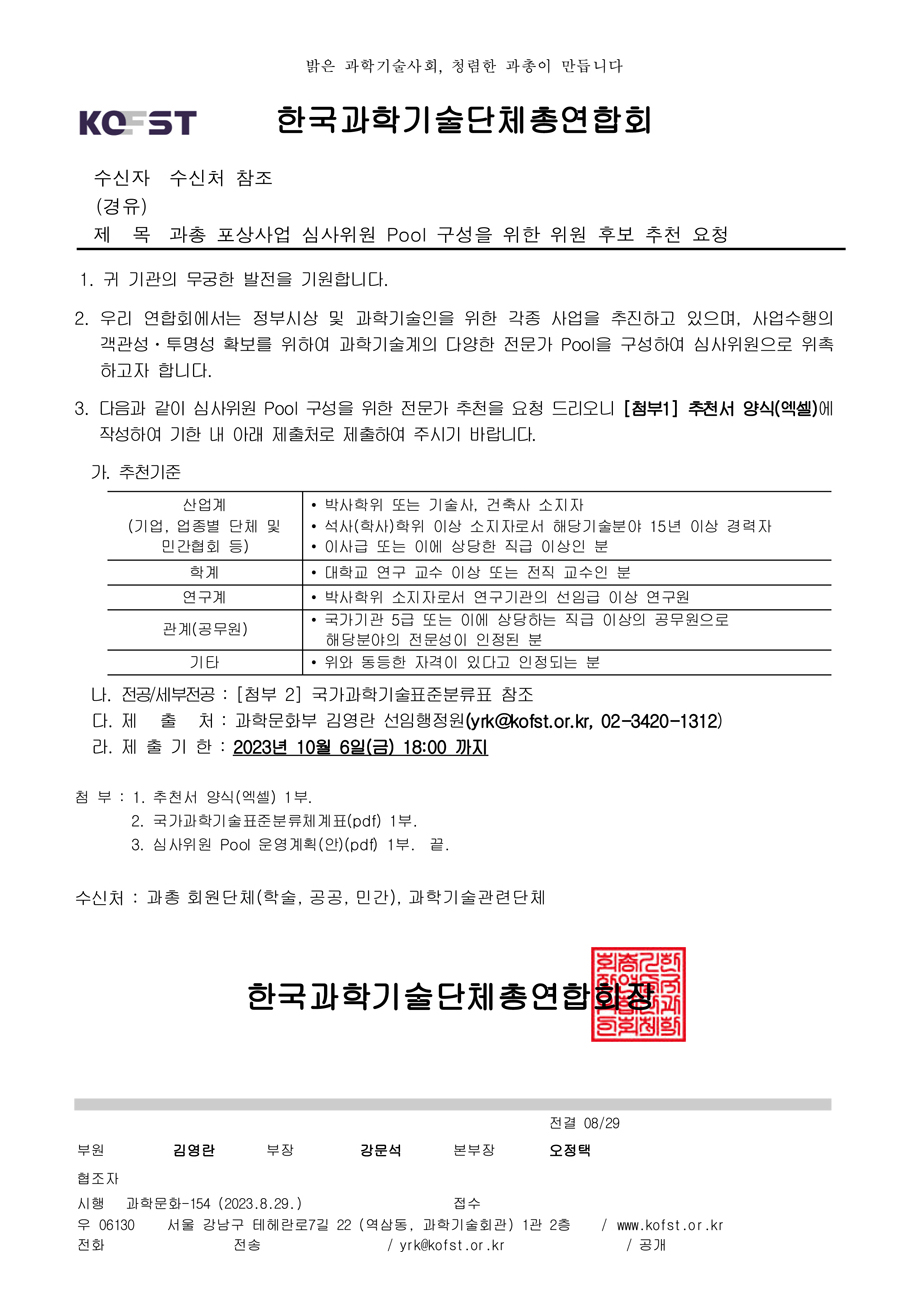 우리 과학기술단체총연합회에서는 정부시상 및 과학기술인을 위한 각종 사업을 추진하고 있으며 , 사업수행의 객관성 ・ 투명성 확보를 위하여 과학기술계의 다양한 전문가 Pool 을 구성하여 심사위원으로 위촉하고자 합니다 .