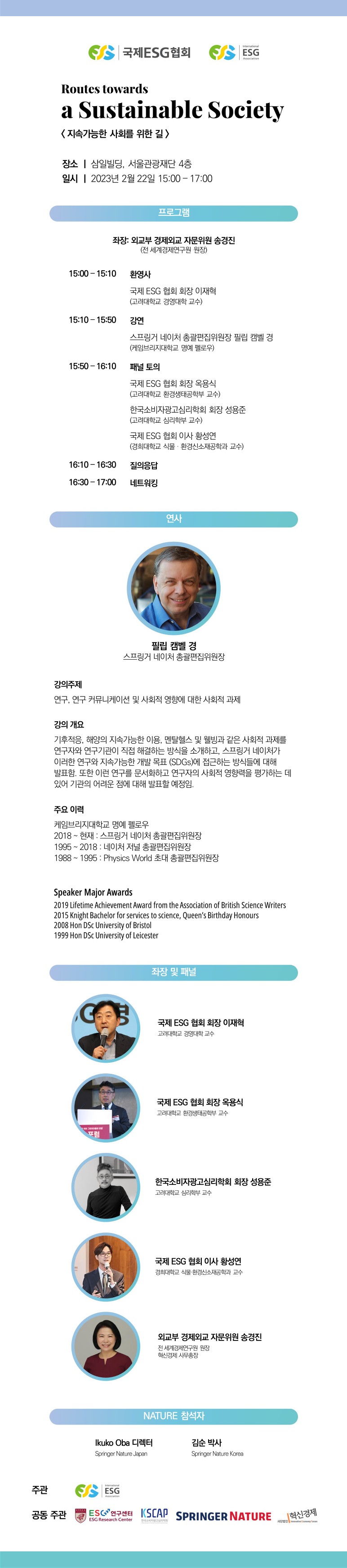 또한 국내ESG분야를 리딩하고 있는 고려대학교 환경생태공학부 옥용식 교수님, 경영대학 이재혁 교수님, 심리학부 성용준 교수님, 경희대학교 황성연 교수님, 세계경제연구원장 송경진 前 원장님께서 좌장 및 패널로 참가할 예정이며, Springer Nature Korea의 김순 박사님과 Springer Nature Japan의 Ikuko Oba 디렉터님 등 국내외 최고의 전문가분들이 함께 참석해주실 예정입니다.