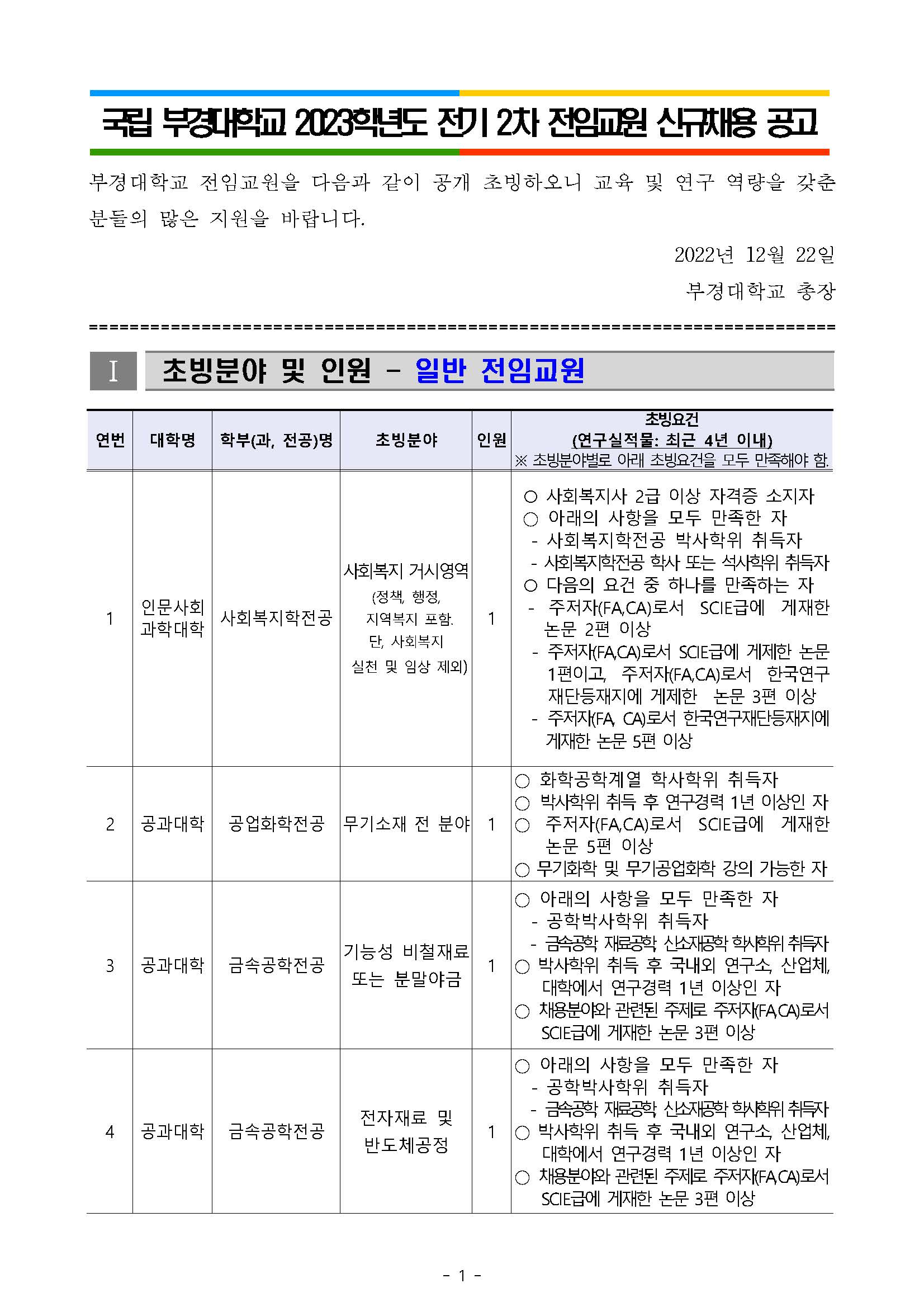국립 부경대학교에서 2023학년도 전기 2차 전임교원 신규채용 공고가 있어 안내드립니다.
