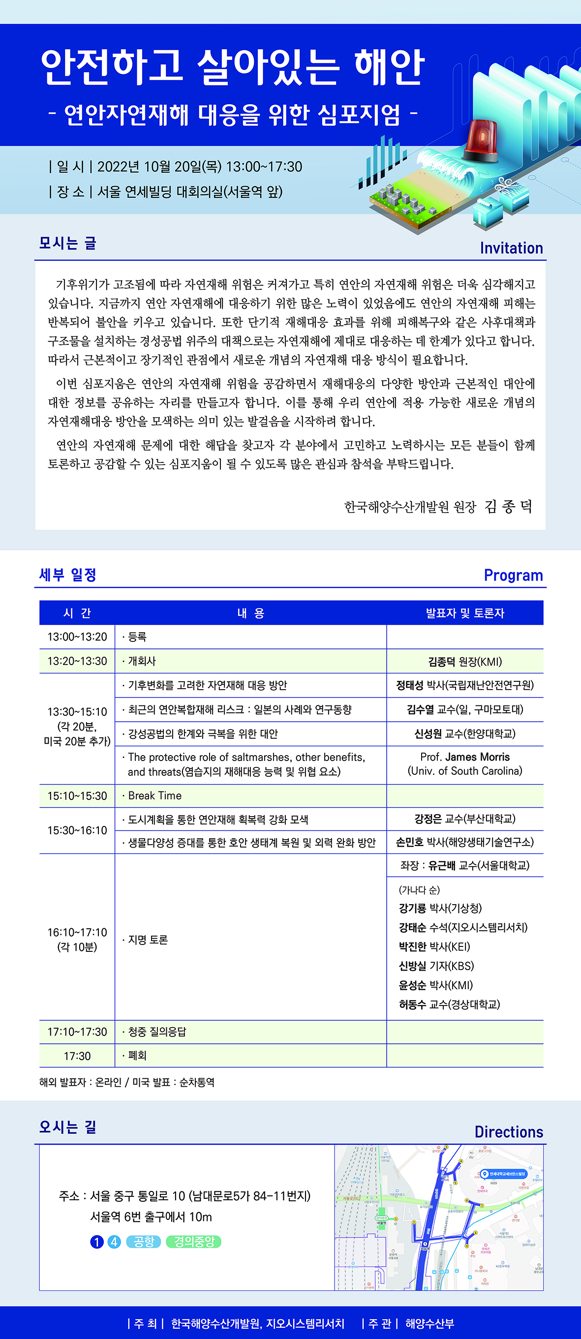 연안의 자연재해 문제에 대한 해답을 찾고자 각 분야에서 고민하고 노력하시는 모든 분들이 함께 토론하고 공감할 수 있는 심포지움이 될 수 있도록 관련 전문가, 일반인 및 학생분들의 많은 관심과 참석을 부탁드립니다.
