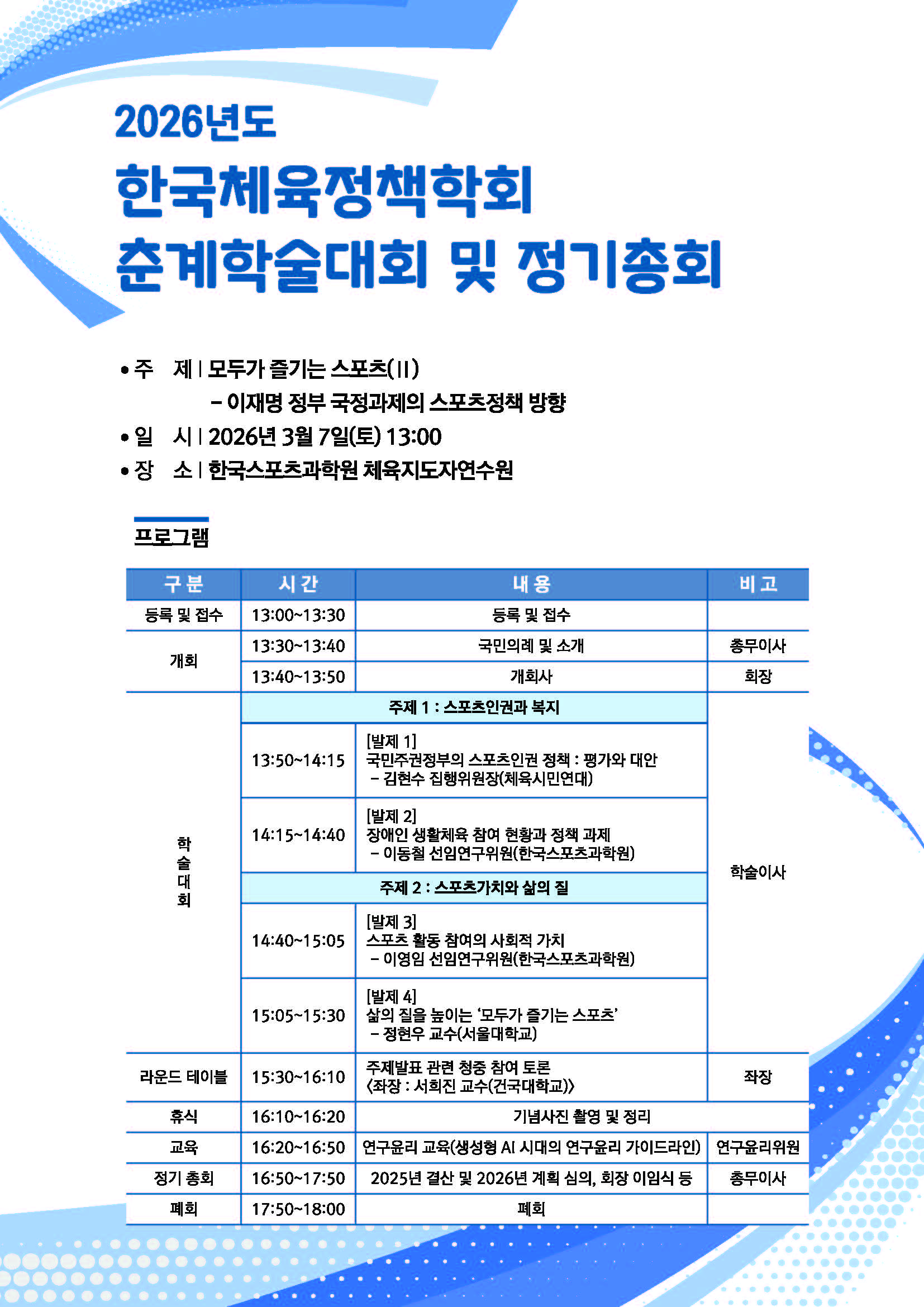 2026년도 한국체육정책학회 춘계학술대회 및 정기총회에 여러분을 초대합니다.