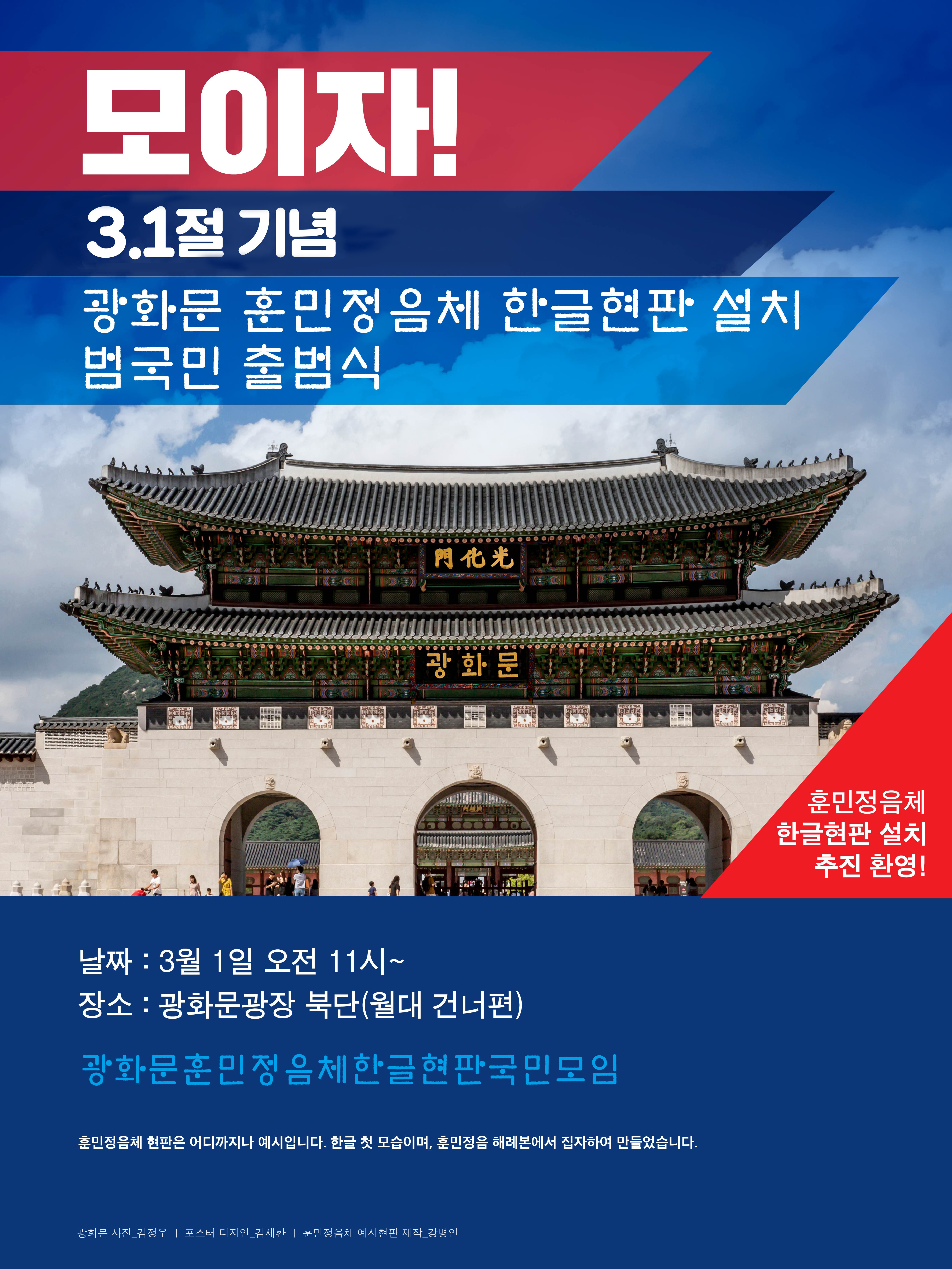 오는 3월 1일 오전 11시, 광화문광장 북단(월대 건너편)에서 ‘광화문 훈민정음체 한글현판 설치 범국민 출범 기자회견’이 열린다.