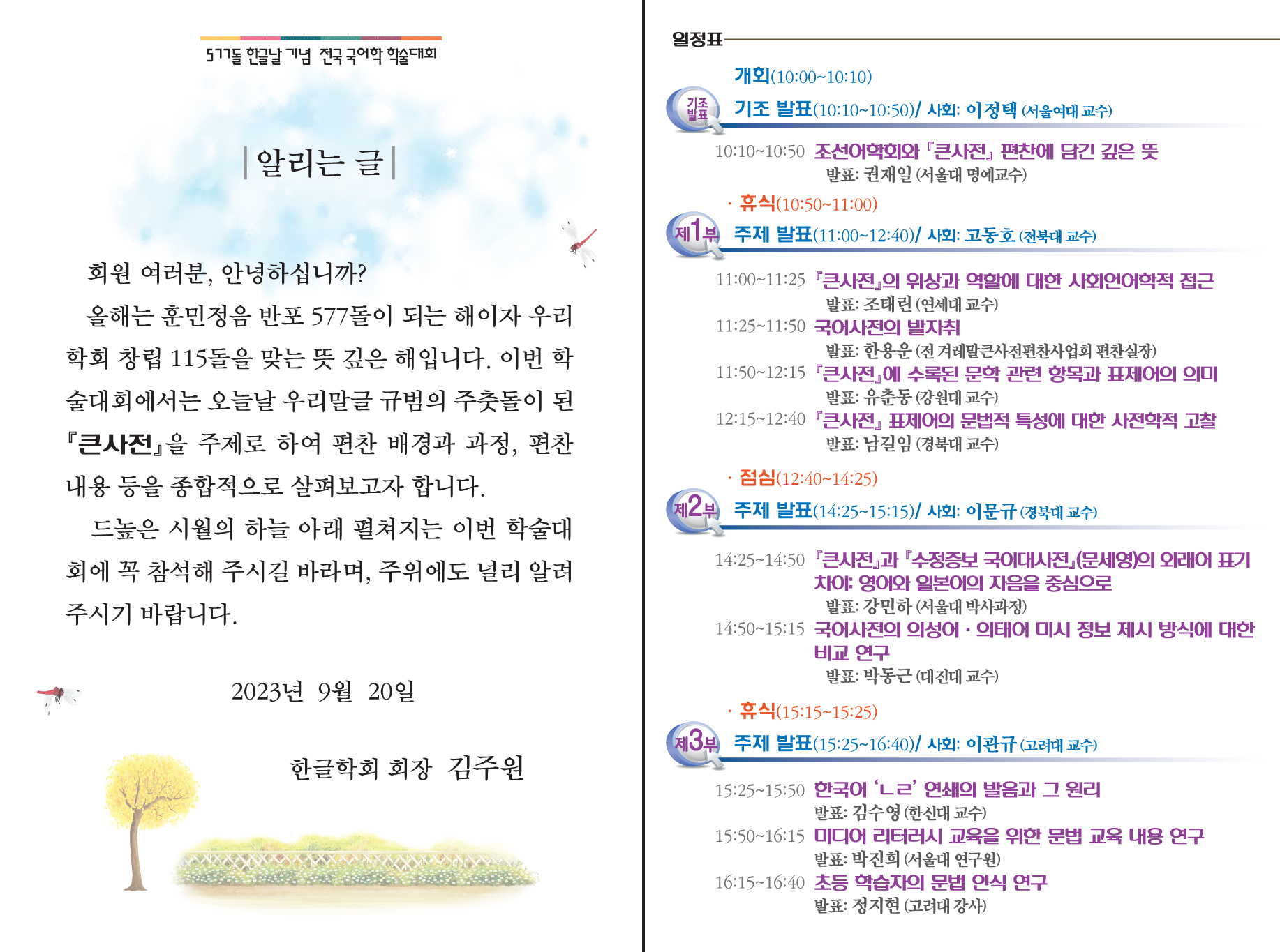 올해는 훈민정음 반포 577돌이 되는 해이자 우리 학회 창립 115돌을 맞는 뜻 깊은 해입니다.