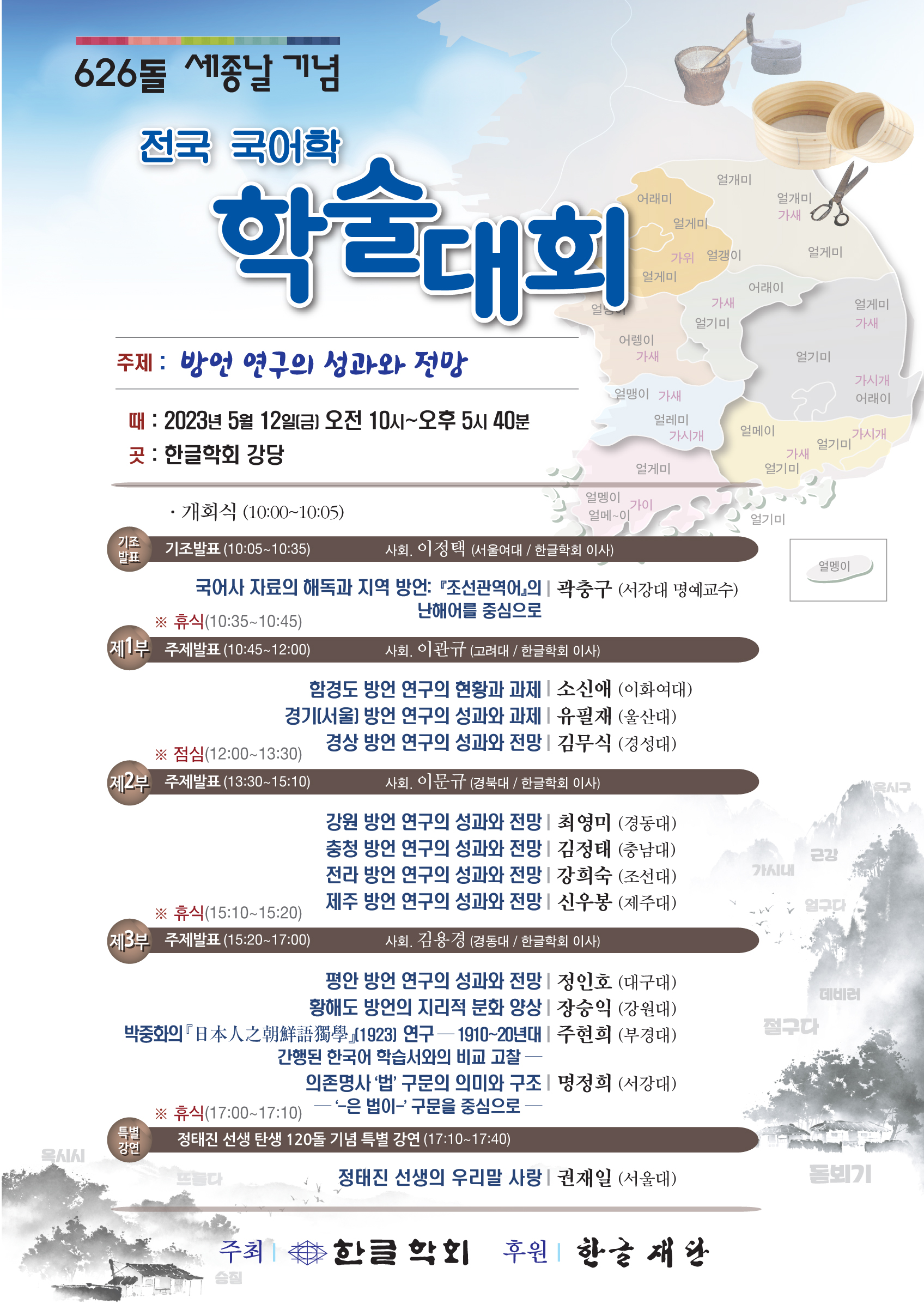 우리 학회는 626돌 세종날을 맞이하여, 한글재단의 후원으로 전국 국어학 학술대회를 마련하였습니다.