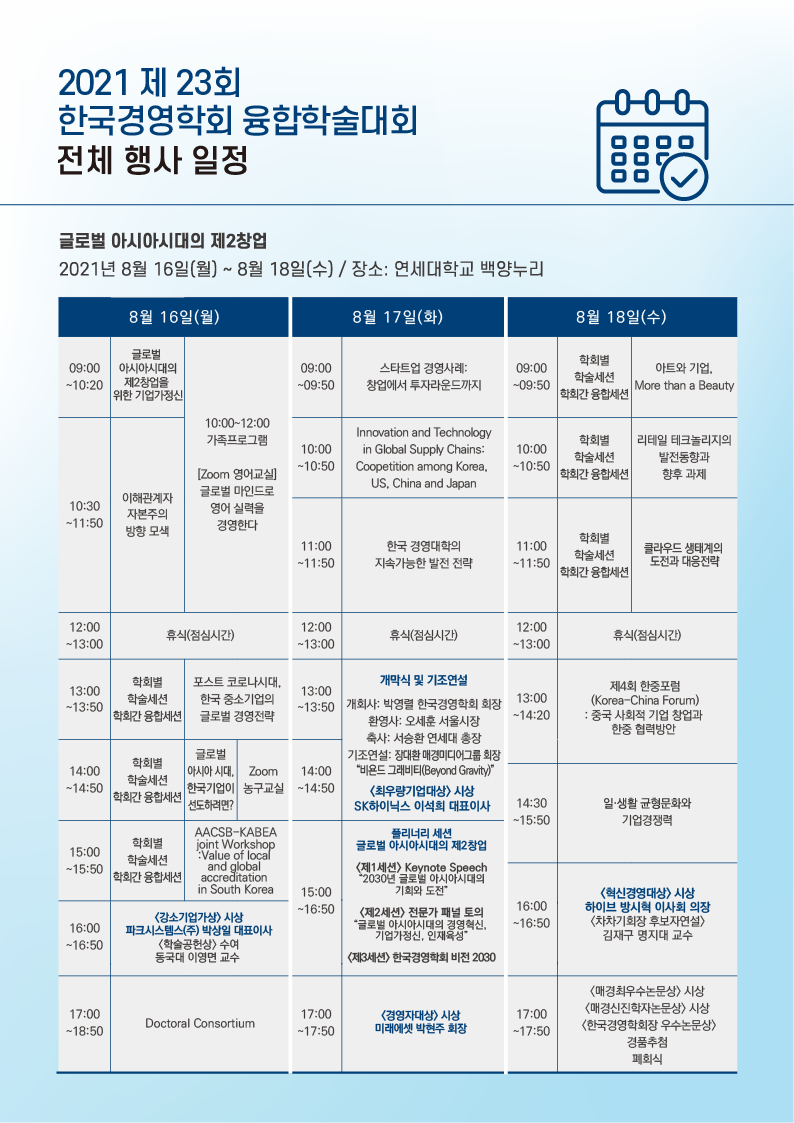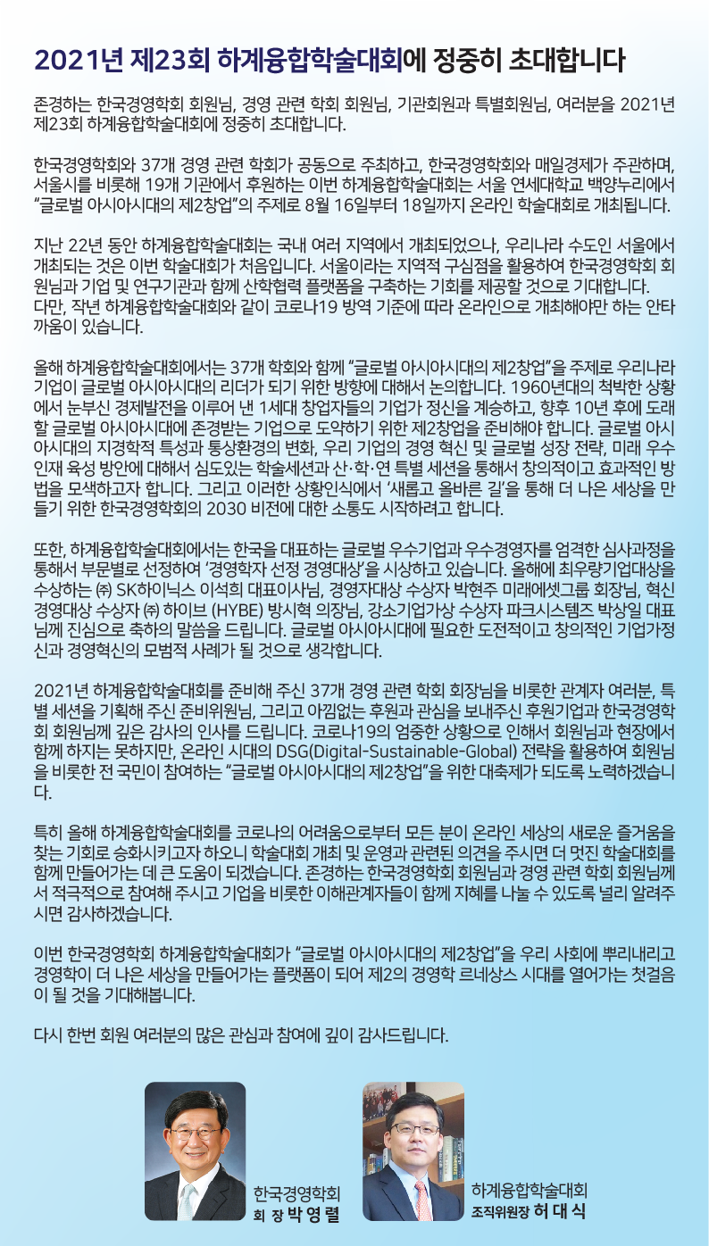 저희 한국미디어경영학회는 2021년 8월 16일부터 8월 18일까지 개최되는 제23회 한국경영학회 융합학술대회에 공동주최 학회로 참가합니다.