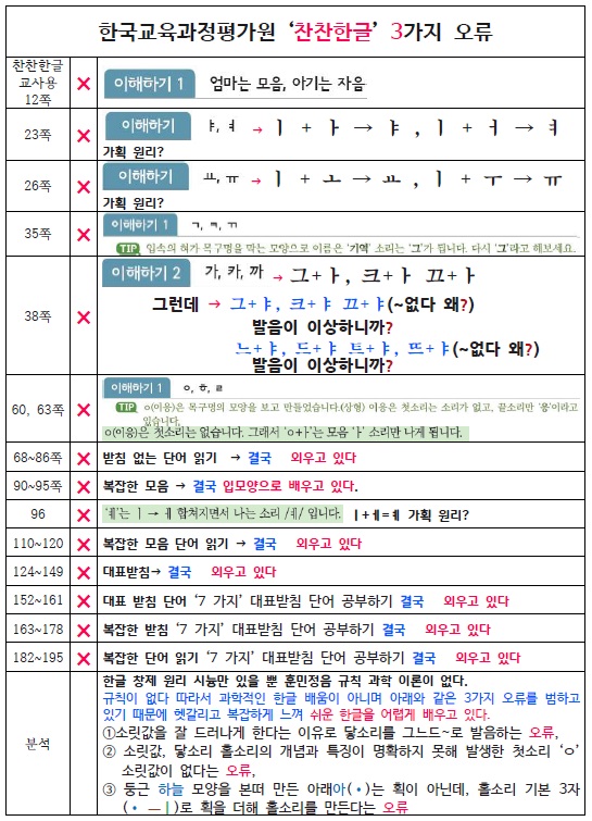 ♥한국교육과정평가원의 '찬찬한글' 3가지 오류, 덩달아 시중 모든 한글책도