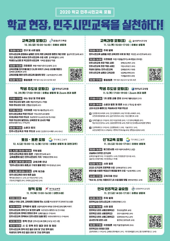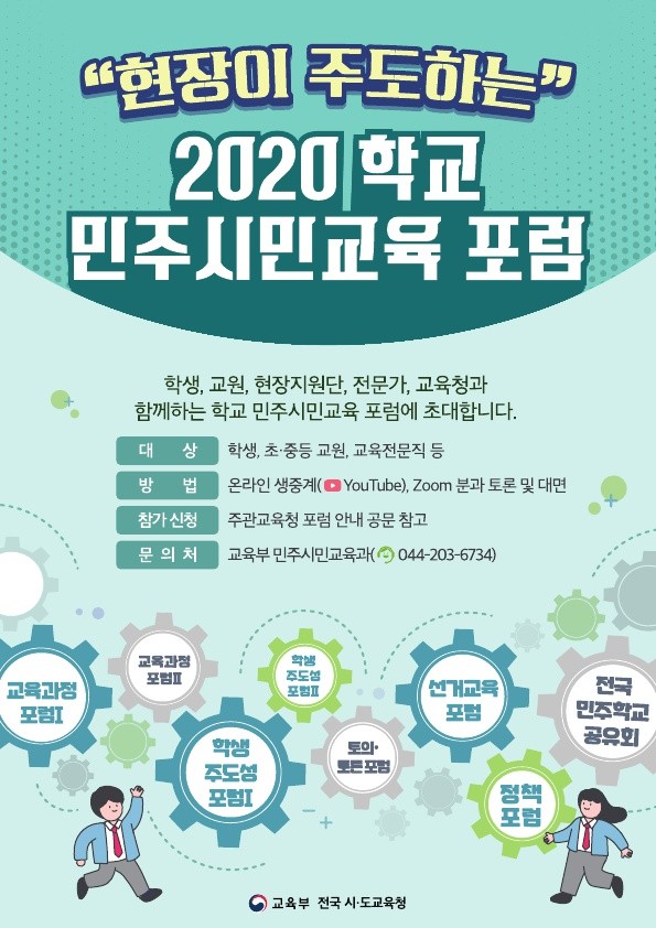 교육과정, 선거교육, 전국 민주학교 공유회 등 다양한 포럼이 준비되어 있는 2020 학교 민주시민교육 포럼에 여러분을 초대합니다.자세한 내용은 다음의 사이트를 참고하시기 바랍니다. https://m.blog.naver.com/moeblog/222129790257
