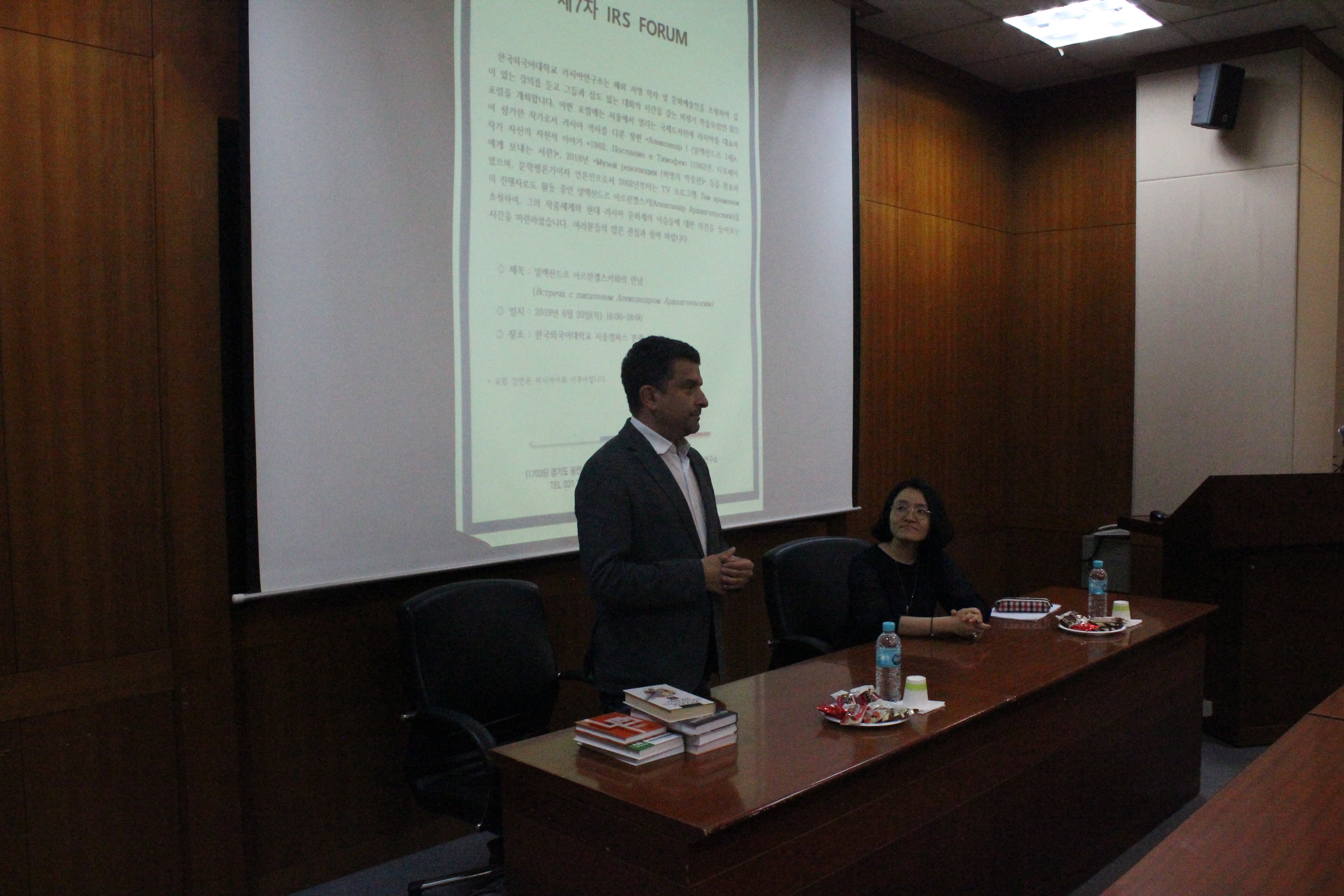 2019년 6월 20일(목) 한국외국어대학교 러시아연구소는 오늘날 러시아의 저명한 작가이자 평론가로 활동하고 있는 알렉산드르 아르한겔스키를 모시고 제7차 IRS Forum을 개최했다. 발표를 통해 알렉산드르 아르한겔스키 작가는 출판된 책을 소개하며 자신과 그의 작품 세계를 설명했고, 이후에는 청중들의 질문에 답변하며 작가에 대한 궁금증을 풀어줬다.