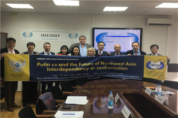 2018년 4월 23일(월) 러시아연구소는 러시아 모스크바 소재 ‘세계경제및국제관계연구소’(IMEMO) 7층 세미나실에서 “푸틴 4.0과 동북아시아의 미래: 상호의존과 대립:(Putin 4.0 and the Future of Northeast Asia: Interdependency and Confrontation)이라는 주제로 심포지움을 개최했다. 이번 심포지움은 한국외대 러시아연구소와 모스크바 IMEMO가 공동으로 제작한 <러시아폴리시리뷰>의 발간을 기념하고 두 연구소의 미래지향적 협력관계를 구축하고자 마련됐다.