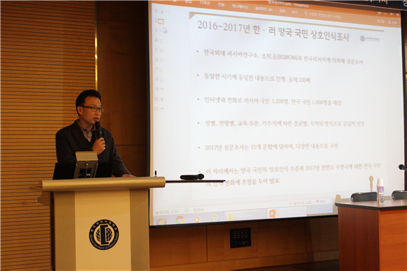 최우익 HK교수는 1세션에서 ‘2017년 한·러 양국 국민 상호인식조사: 한국 국민의 인식을 중심으로’라는 주제를 발표했다. 한국외대 러시아연구소는 2016년에 이어 2017년에도 러시아여론조사센터(프치옴)와 한국리서치에 의뢰해 한국과 러시아 국민을 대상으로 설문조사를 벌였으며, 최우익 교수는 한국 국민의 인식을 중심으로, 그리고 같은 세션 안나 쿨레쇼바 프치옴 수석연구원은 러시아 국민의 인식을 중심으로 설문 결과를 발표했다. 설문 결과의 자세한 내용은 한국외대 러시아연구소 홈페이지에서 확인할 수 있다.