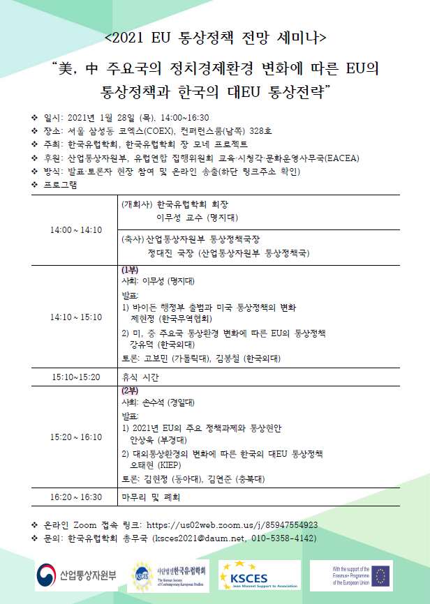 본 행사의 개회사는 한국유럽학회 이무성 회장님께서 전달해 주셨고, 산업통상자원부 정대진 통상정책국장님께서 축사를 전달해 주셨습니다.