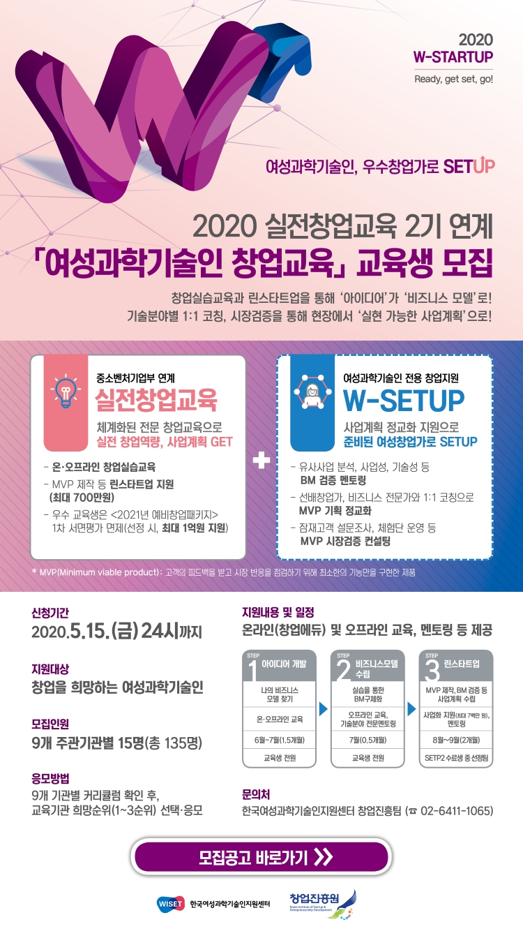 한국여성과학기술인지원센터(WISET) 에서 창업진흥원관 함께 2020년 실전창업교육 2기 연계 「여성과학기술인 창업교육」을 실시함을 안내드립니다.