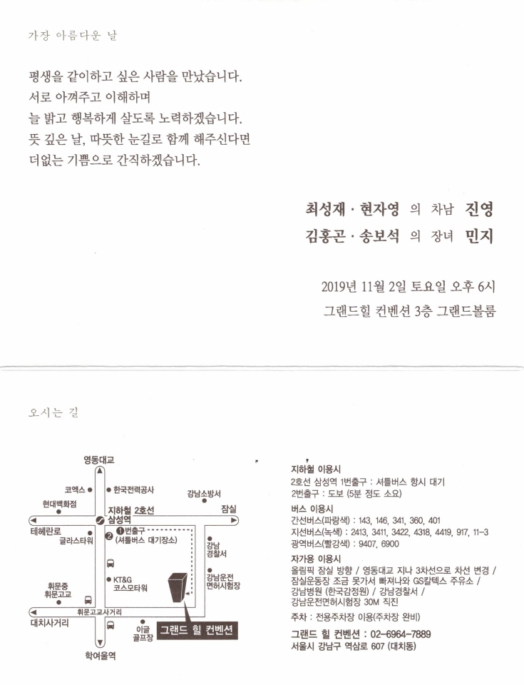 - 결혼식장 : 그랜드힐 컨벤션 3층 그랜드 볼룸