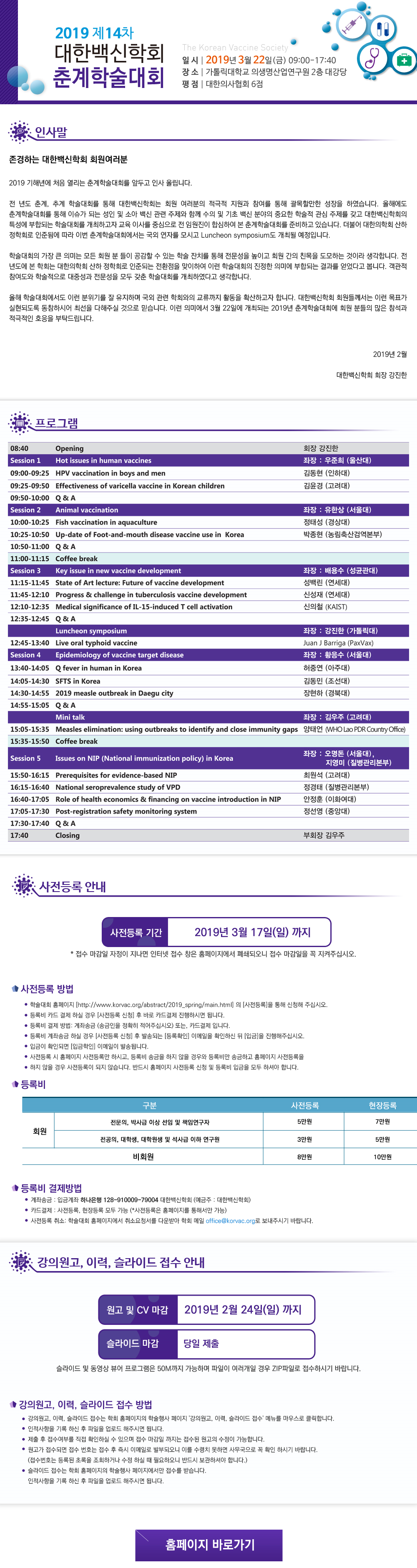 백신 개발, 백신관련 정책 이슈, 수의학 분야 백신 등)를 가지고 2019 제14차 대한백신학회 춘계학술대회를 다음과 같이 개최합니다.