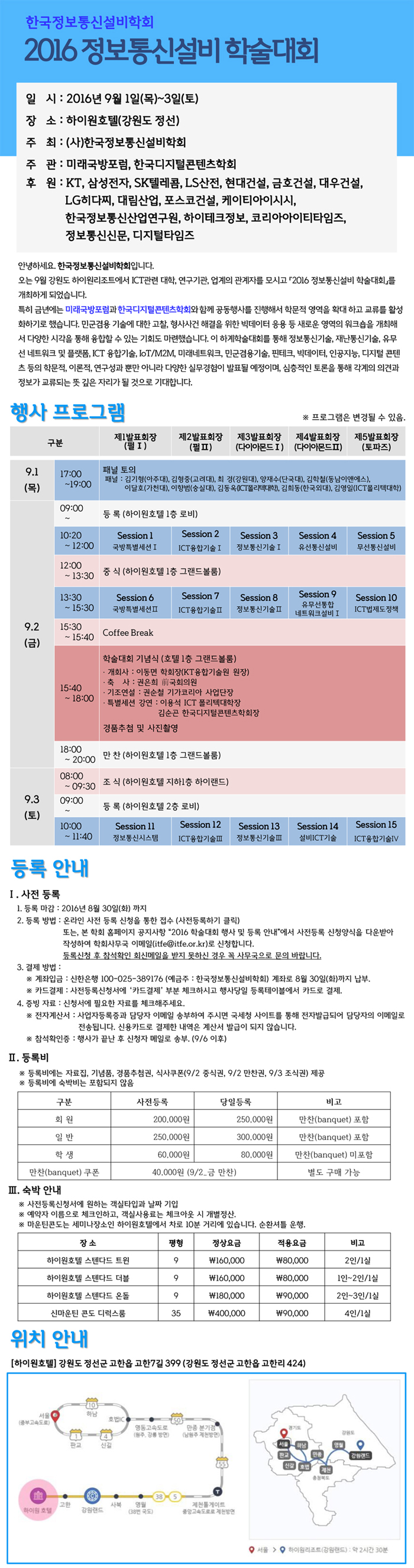 안녕하세요. 한국디지털콘텐츠학회 사무국입니다 한국정보통신설비학회가 주최하고 우리학회가 공동으로 주관하는 '2016 정보통신설비 하계학술대회'가 9월 1일(목)~3일(토)까지 강원도 정선 하이원호텔에서 개최되오니 학교, 관련기업 및 기관을 포함, 아울러 관심 있는 모든 분들의 적극적 참여와 협조를 부탁드립니다. 자세한 내용은 '2016 정보통신설비 학술대회 행사안내(9.1~9.3)_V2.pdf' 파일을 참고하여 주시기 바랍니다. 사전등록 신청하기링크 :
