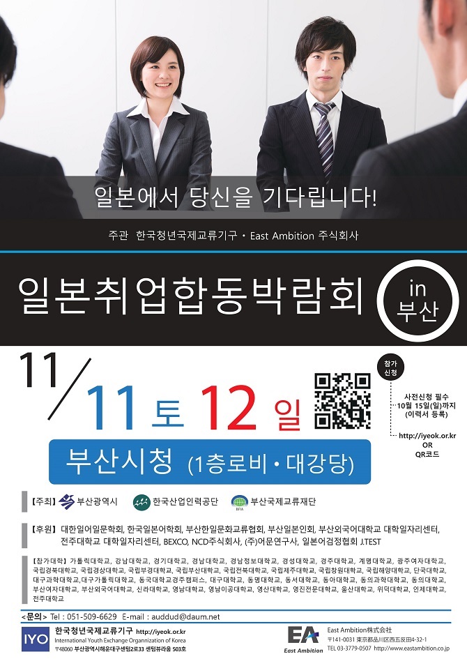 본 학회가 후원하고 부산광역시와 산업인력공단이 주최하며 한국청년국제교류기구가 주관하는 <일본취업합동박람회 in 부산>를 안내해 드리고자 합니다.