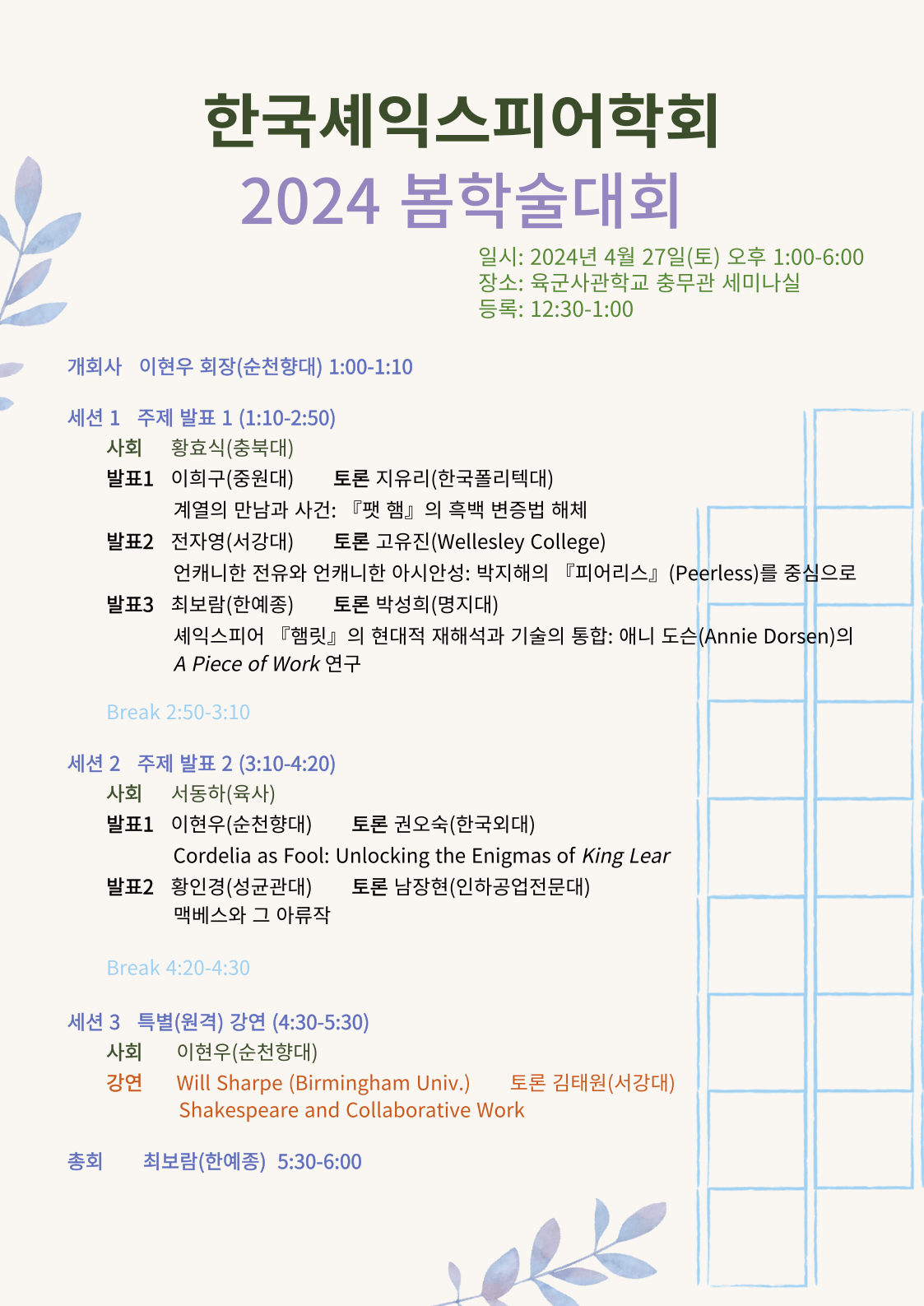 한국 셰익스피어학회 2024년 봄 정기학술대회 소식을 알려드립니다. [리마인더]