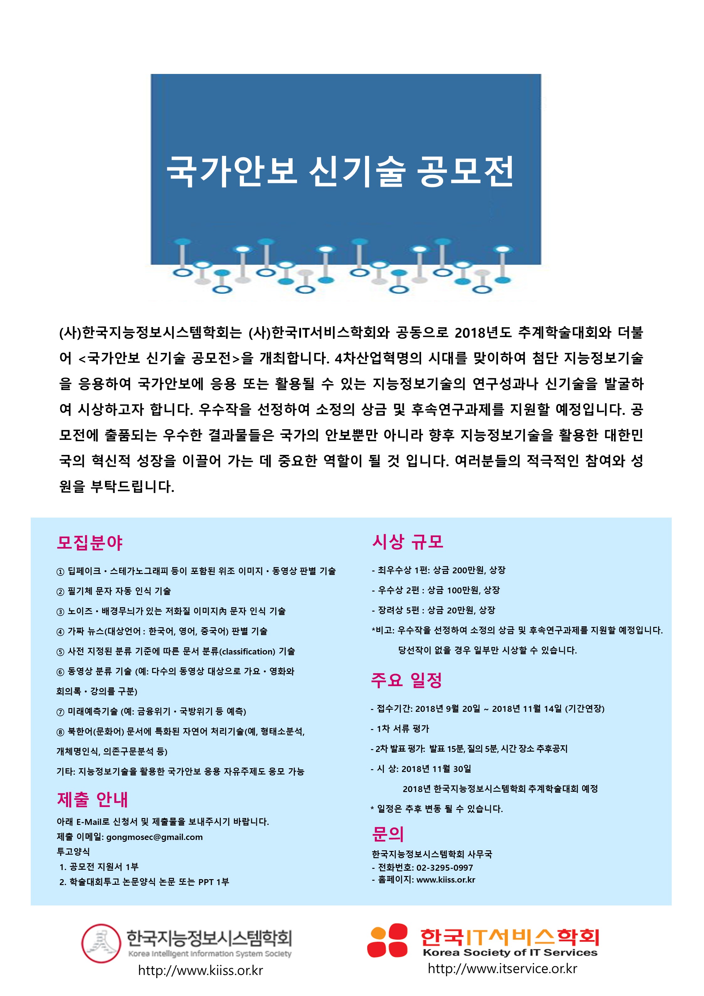 (사)한국지능정보시스템학회는 (사)한국IT서비스학회와 공동으로 2018년도 추계학술대회와 더불어 <국가안보 신기술 공모전>을 개최합니다. 4차산업혁명의 시대를 맞이하여 첨단 지능정보기술을 응용하여 국가안보에 응용 또는 활용될 수 있는 지능정보기술의 연구성과나 신기술을 발굴하여 시상하고자 합니다. 우수작을 선정하여 소정의 상금 및 후속연구과제를 지원할 예정입니다. 공모전에 출품되는 우수한 결과물들은 국가의 안보뿐만 아니라 향후 지능정보기술을 활용한 대한민국의 혁신적 성장을 이끌어 가는 데 중요한 역할이 될 것 입니다. 여러분들의 적극적인 참여와 성원을 부탁드립니다.