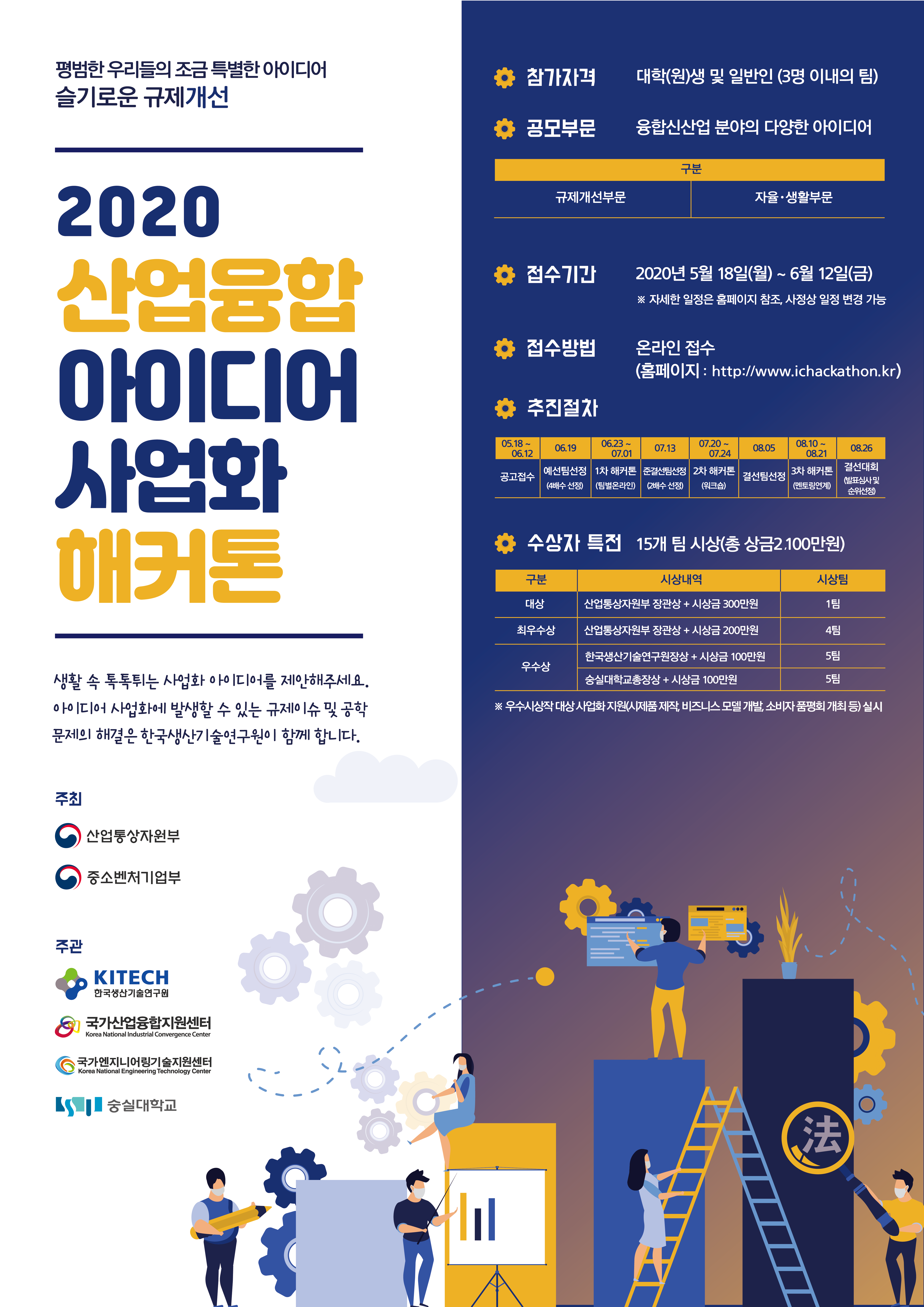 산업통상자원부, 중소벤처기업부, 한국생산기술연구원 및 숭실대학교에서는 산업융합 아이디어를 실현가능성 있는 융합 신산업으로의 성장을 지원하기 위한 "2020 산업융합 아이디어 사업화 해커톤"을 추진하고자 합니다.