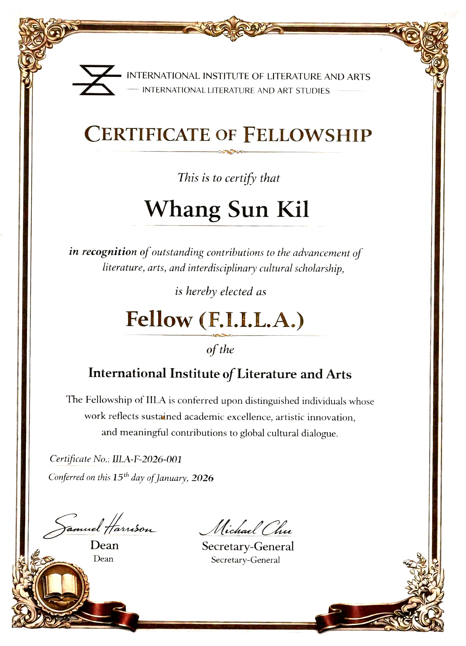 제가 한국뿐만 아니라 세계 문학,미술,음악 등 예술인들의 전시회, 학술대회. 출판 등을 지원하는 국제문학예술연구소 IILA(International Institute of Literature and Arts)의 Fellow(연구원)로 선정됐습니다.