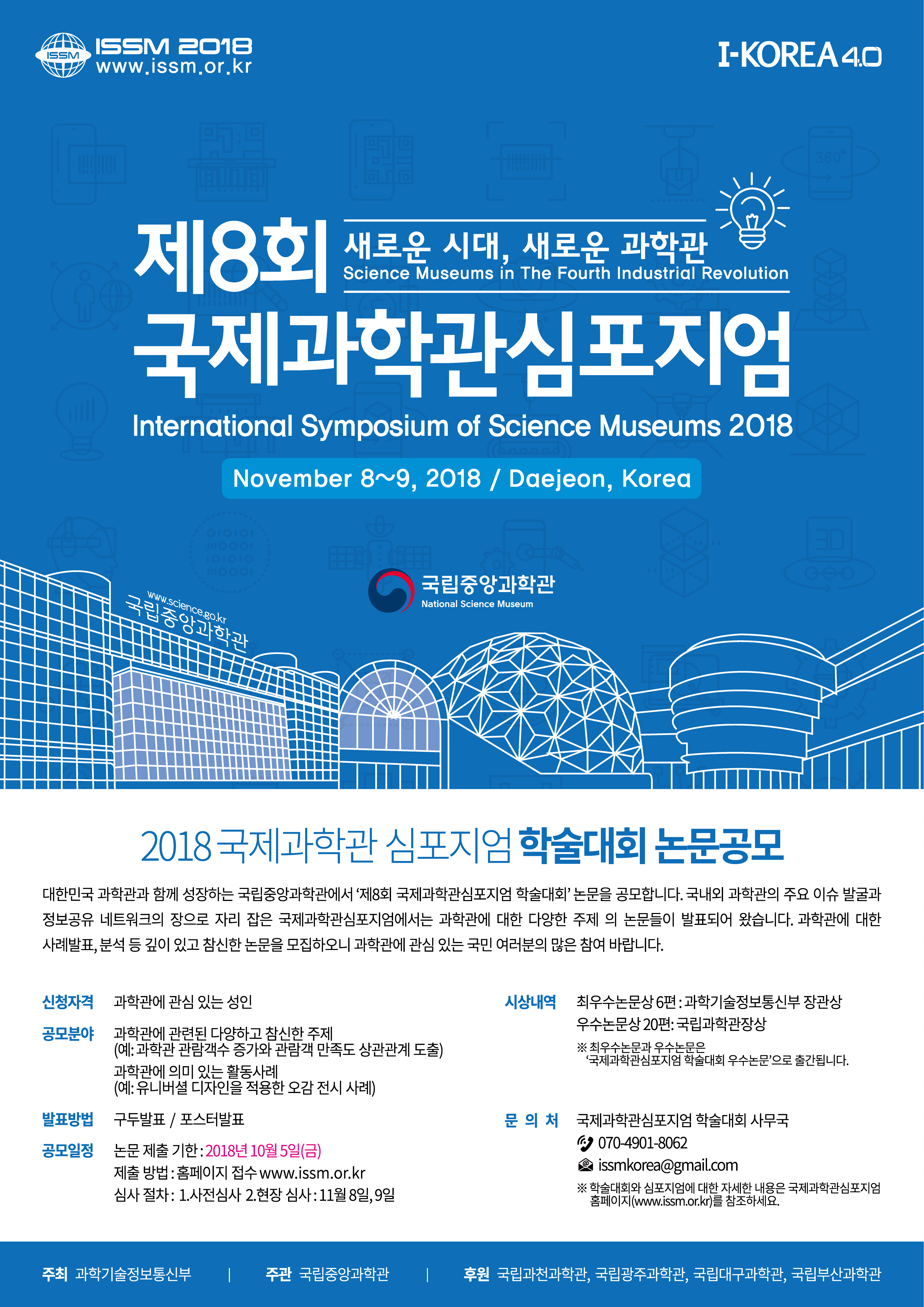 ISSM 2018은 국립중앙과학관에서 주관하여 올해로 제 8회를 맞이하는 국제과학관심포지엄으로 Nina Simon (참여형 박물관 저자), Noah Roford 등의 저명한 인물들의 기조강연 및 국내외 과학관 관련 전문가 들의 강연, 발표 등이 진행되며 ‘새로운 시대, 새로운 과학관’을 주제로 이야기 나누려 합니다. 4차 산업혁명으로 일컬어지는 거대한 변화 속에서 과학관들이 현재 무엇을 해야 하는지, 앞으로 무엇을 해야 하는지에 대한 내용이 다루어질 예정입니다. 이에 역량있는 연구자, 전문가분들의 많은 참여 부탁드립니다.