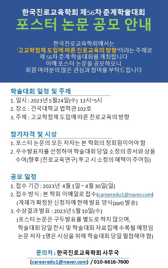 '고교학점제 도입에 따른 진로교육의 방향'이라는 주제로 제56차 춘계학술대회를 개최할 예정입니다.