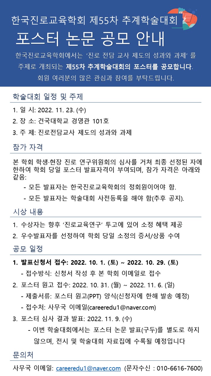 '진로전담교사 제도의 성과와 과제'라는 주제로 제55차 추계학술대회를 개최할 예정입니다.