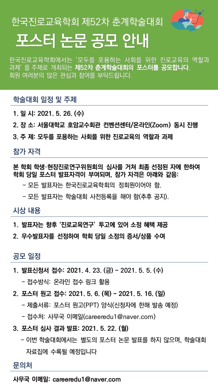 '모두를 포용하는 사회를 위한 진로교육의 역할과 과제'라는 주제로 제52차 춘계학술대회를 개최할 예정입니다.