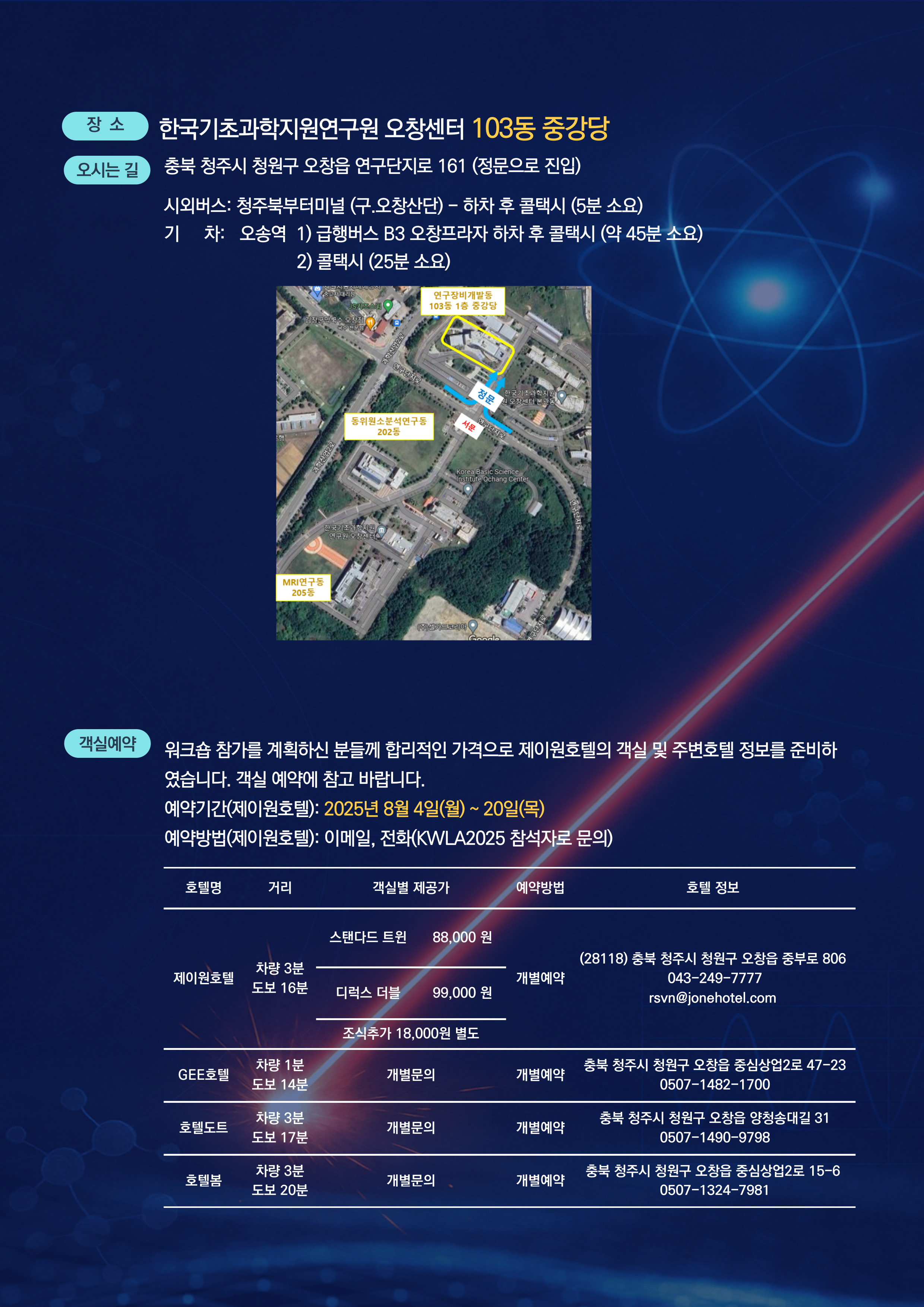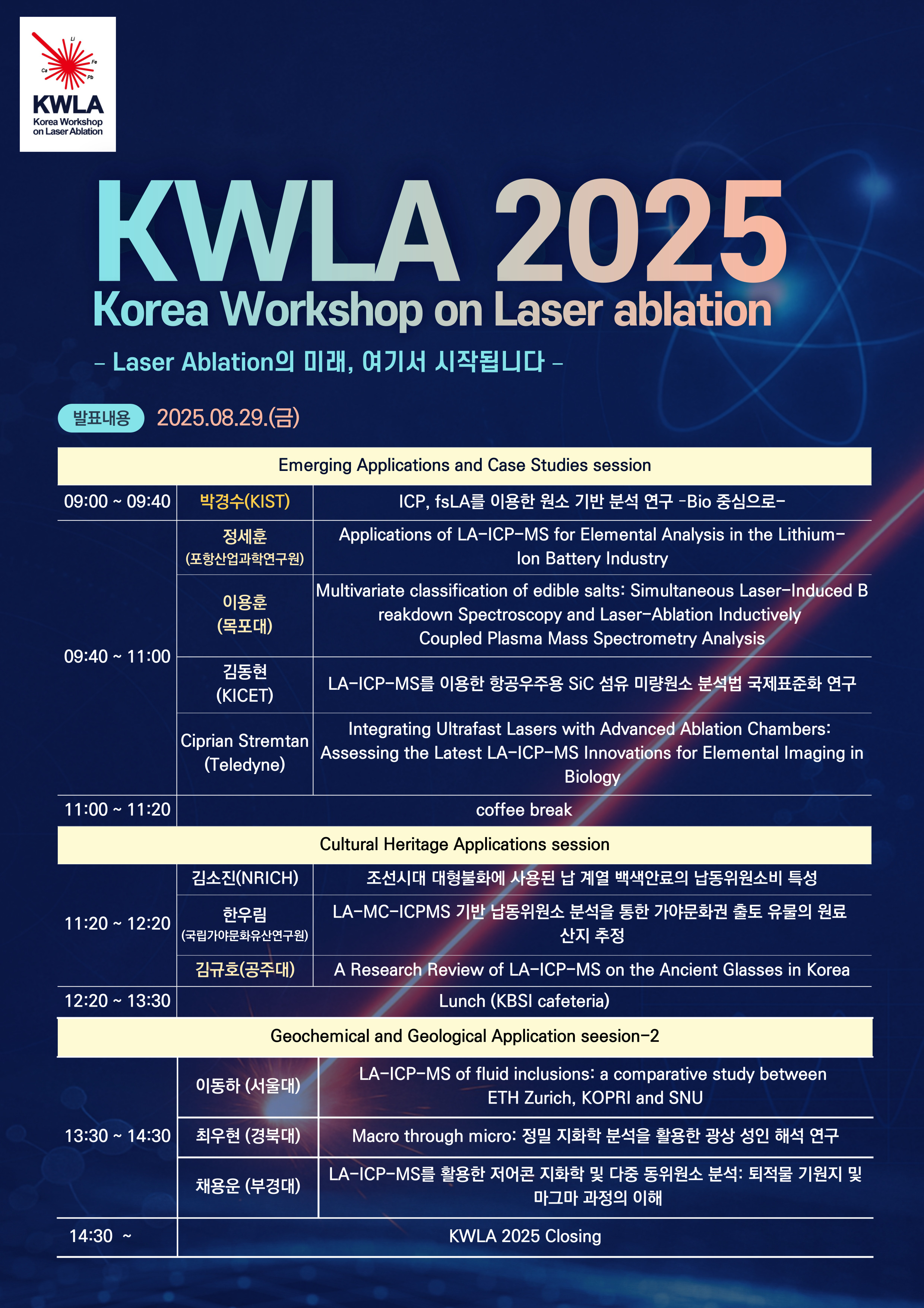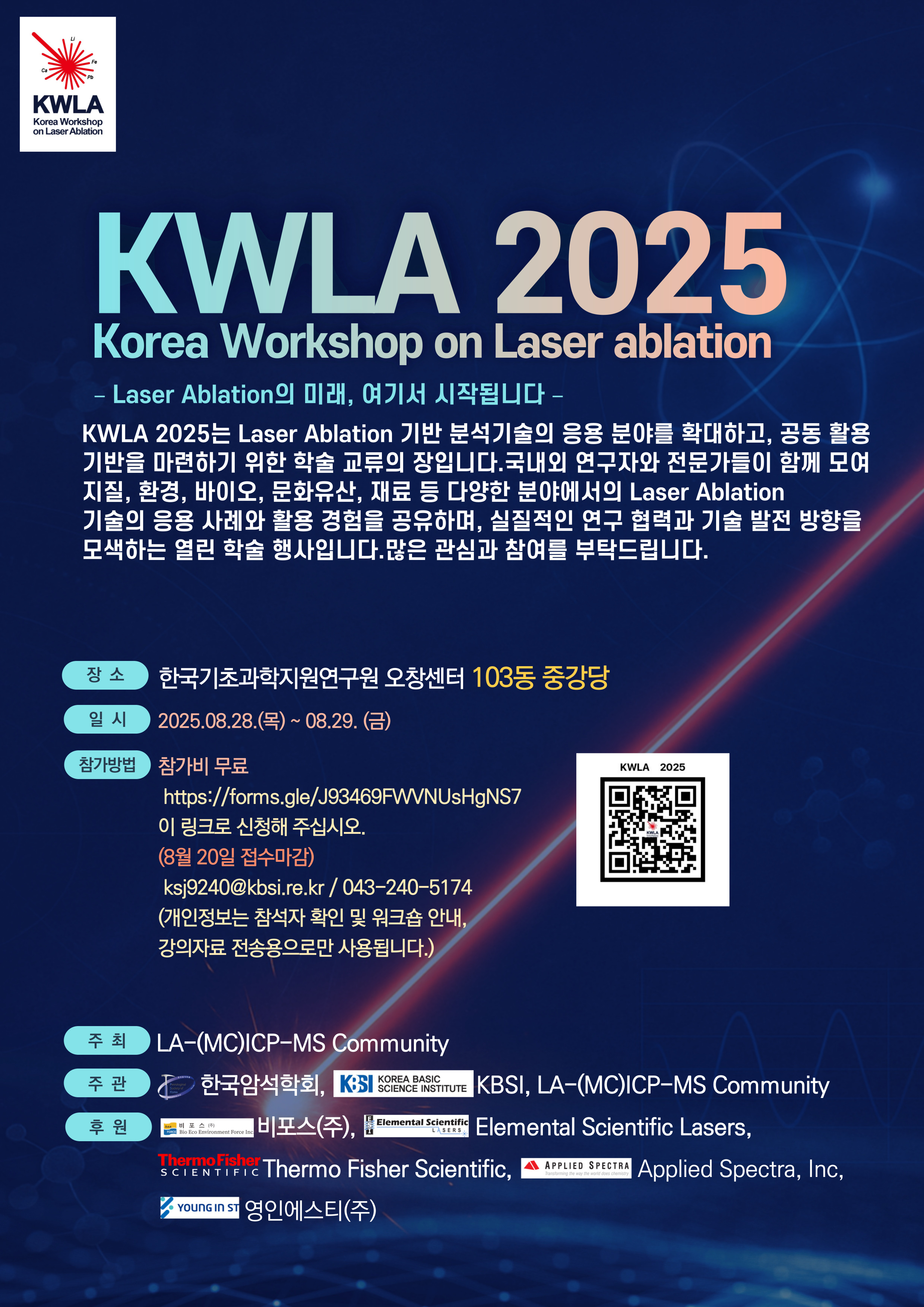 오는 8월 28일-29일 양일간, KWLA 2025 (Korea Workshop on Laser Ablation)가 한국기초과학지원연구원 오창바이오 환경연구소에서 개최됩니다.