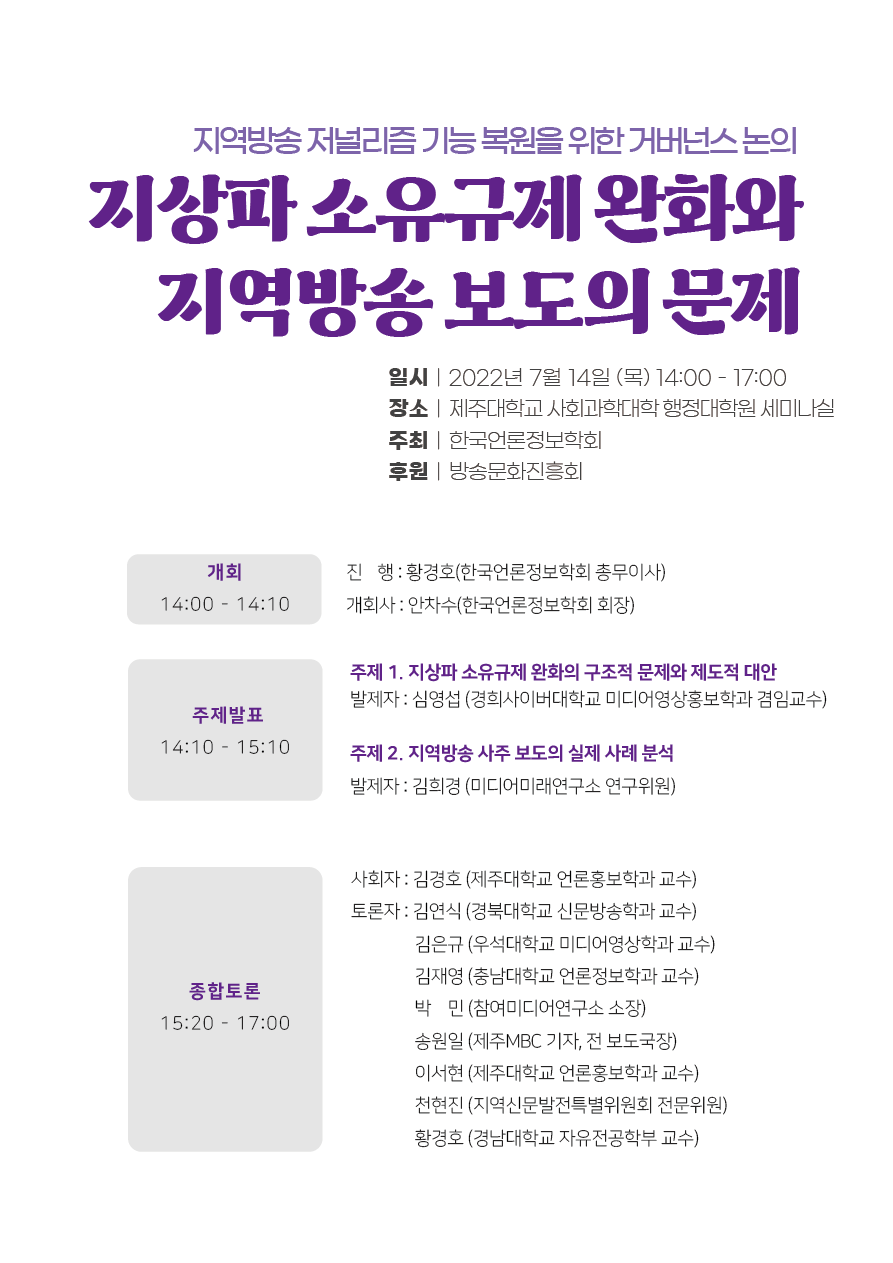 2. 한국언론정보학회는 방송문화진흥회 후원 학술세미나 <지역방송 저널리즘 기능 복원을 위한 거버넌스 논의: 지상파 소유규제 완화와 지역방송 보도의 문제>를 다음과 같이 개최합니다. 회원 여러분의 많은 관심과 참여를 부탁드립니다. 감사합니다.