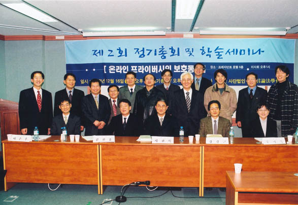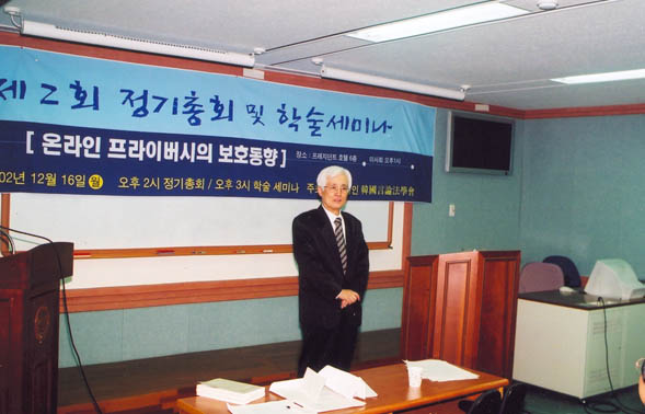 2002년 12월 16일 프레지던트호텔 6층에서 있었던 언론법학회 정기총회 및 학술 세미나 시작에 앞서 원우현 회장이 개회사를 하고 있다.