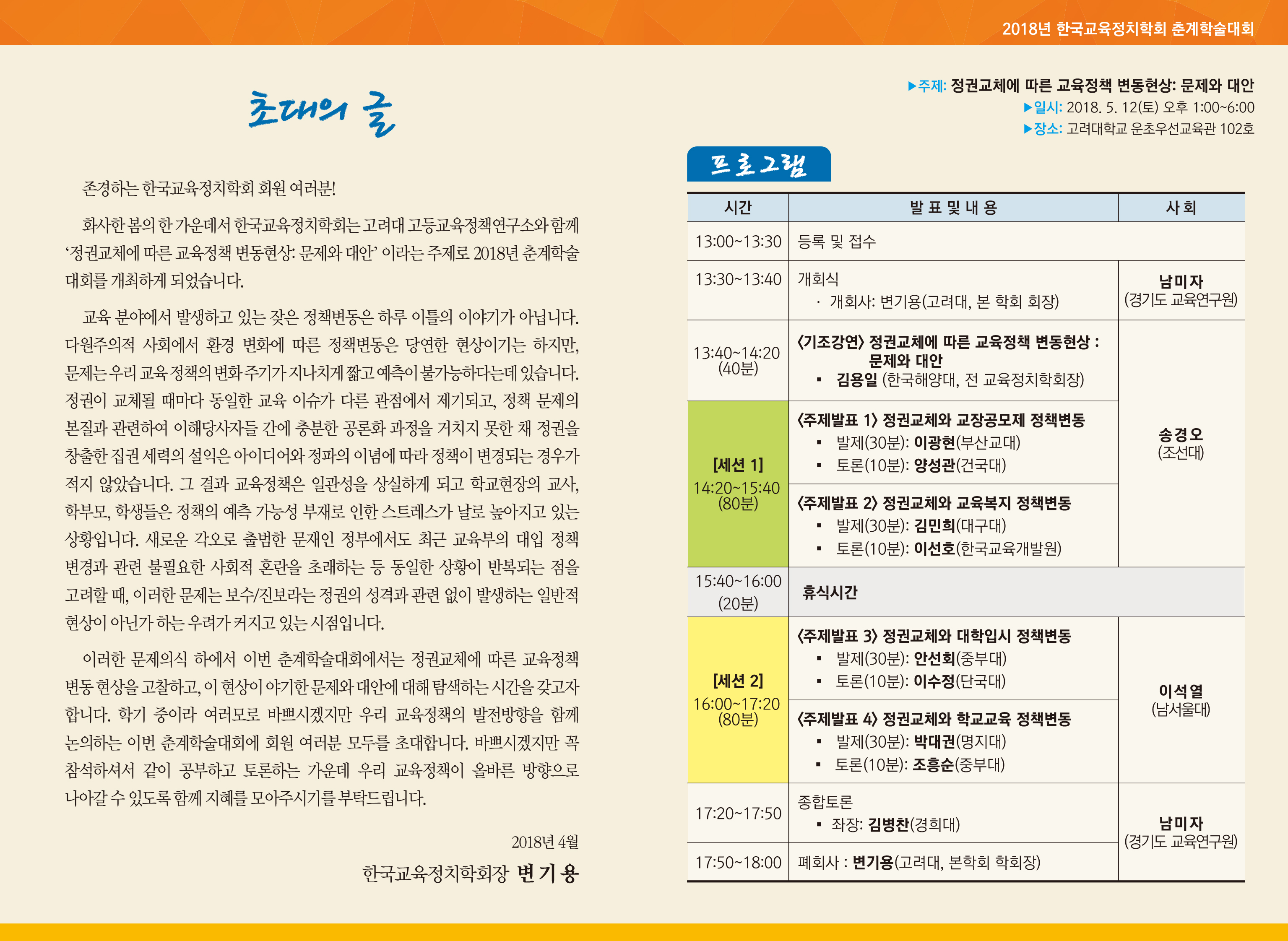 안녕하세요? 한국교육정치학회에서 개최하는 2018년도 춘계학술대회를 다음과 같이 안내드립니다.