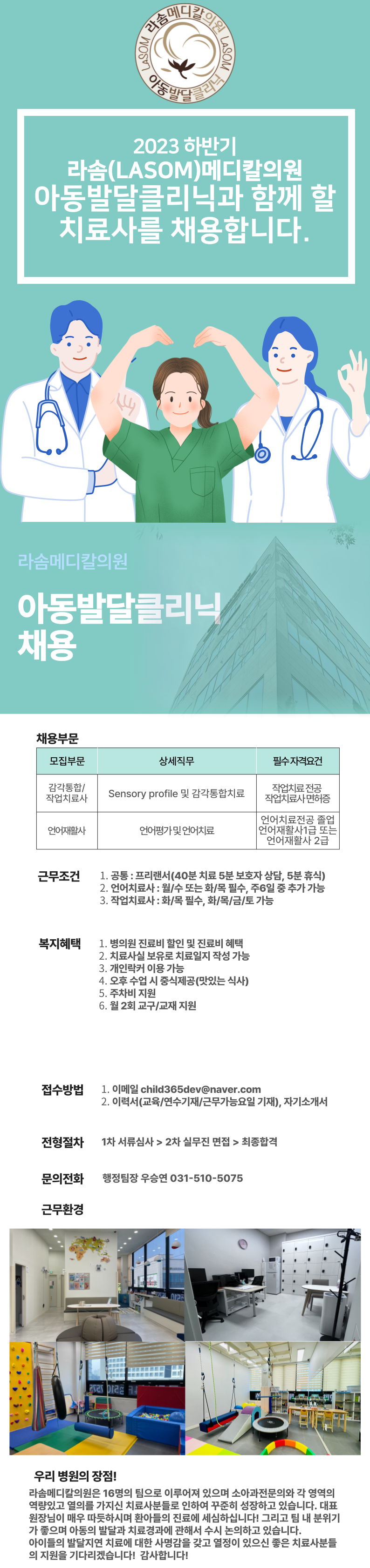 라솜메디칼의원에서는 아이들을 사랑하고 열정이 넘치며 배우고자 열의가 있으신 언어재활사 선생님을 모시고자 하오니 많은 지원을 부탁드립니다.